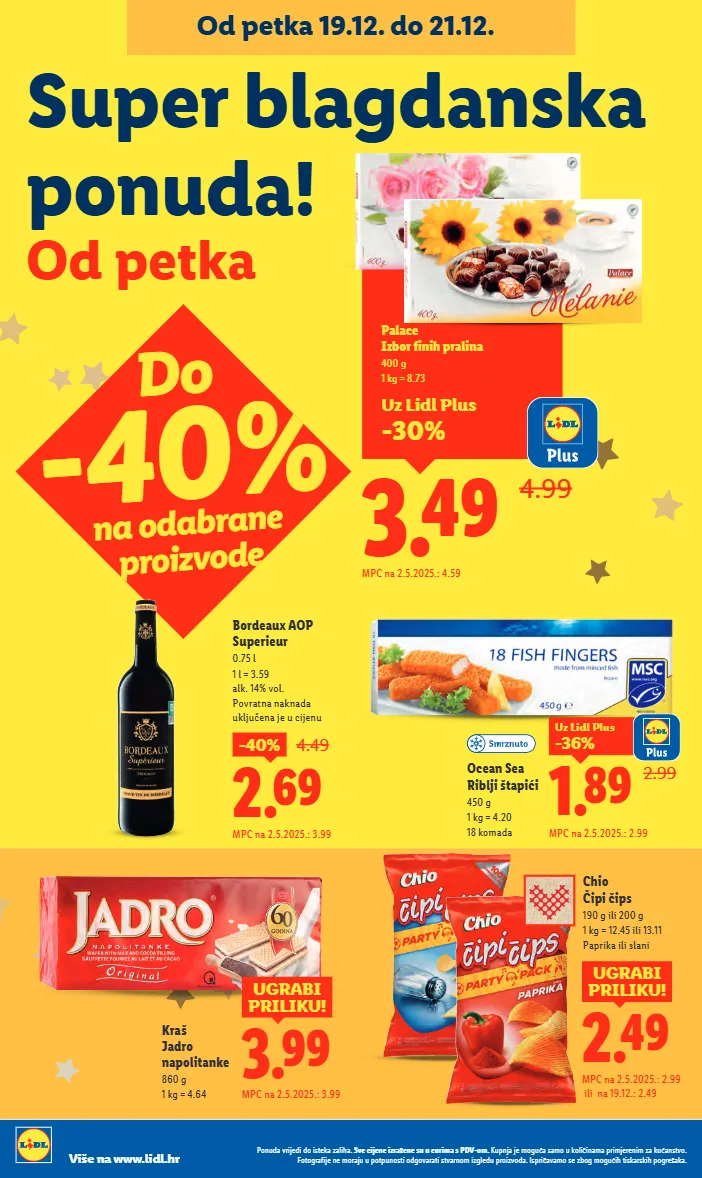 do -40% na odabrane proizvode chio čipi čips 190 g ili 200 g 1 kg = 12.45 ili 13.11 paprika ili slani 2.49 ugrabi priliku! mpc na 2.5.2025.: 2.99 ili na 19.12.: 2.49 3.99 ugrabi priliku! mpc na 2.5.2025.: 3.99 kraš jadro napolitanke 860 g 1 kg = 4.64 ocean sea riblji štapići 450 g 1 kg = 4.20 18 komada 2.69 -40% 4.49 mpc na 2.5.2025.: 3.99 bordeaux aop superieur 0.75 l 1 l = 3.59 alk. 14% vol. povratna naknada uključena je u cijenu uz lidl plus -30% 3.49 4.99 palace izbor finih pralina 400 g 1 kg = 8.73 mpc na 2.5.2025.: 4.59 super blagdanska ponuda! od petka 2.99 1.89 -36% uz lidl plus mpc na 2.5.2025.: 2.99 ponuda vrijedi do isteka zaliha. sve cijene izražene su u eurima s pdv-om. kupnja je moguća samo u količinama primjerenim za kućanstvo. fotografije ne moraju u potpunosti odgovarati stvarnom izgledu proizvoda. ispričavamo se zbog mogućih tiskarskih pogrešaka. više na www.lidl.hr od petka 19.12. do 21.12.