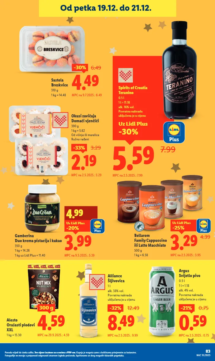 8.49 -32% 12.49 mpc na 2.5.2025.: 9.99 alliance šljivovica 1 l alk. 38% vol. povratna naknada uključena je u cijenu 0.59 -21% 0.75 mpc na 2.5.2025.: 0.75 argus svijetlo pivo 0.5 l 1 l = 1.18 alk. 4% vol. povratna naknada uključena je u cijenu bellarom family cappuccino ili latte macchiato 500 g 1 kg = 6.58 4.39 3.29 -25% uz lidl plus mpc na 2.5.2025.: 3.95 2.19 -33% 3.29 mpc na 2.5.2025.: 3.29 okusi zavičaja domaći vjenčići 390 g 1 kg = 5.62 od višnje ili marelice ručno rađeni alesto orašasti plodovi xxl 1 kg = 15.30 uz lidl plus -30% 5.59 7.99 spirits of croatia teranino 0.5 l 1 l = 11.18 alk. 16% vol. povratna naknada uključena je u cijenu mpc na 2.5.2025.: 7.99 3.99 4.99 mpc na 9.5.2025.: 5.39 -20% uz lidl plus gamberina duo krema pistacija i kakao 350 g 1 kg = 14.26 1 kg uz lidl plus = 11.40 4.59 300 g mpc na 29.9.2025.: 4.59 4.49 -30% 6.49 mpc na 9.7.2025.: 6.49 sastela breskvice 310 g 1 kg = 14.48 83 nac 51/2025 ponuda vrijedi do isteka zaliha. sve cijene izražene su u eurima s pdv-om. kupnja je moguća samo u količinama primjerenim za kućanstvo. fotografije ne moraju u potpunosti odgovarati stvarnom izgledu proizvoda. ispričavamo se zbog mogućih tiskarskih pogrešaka. od petka 19.12. do 21.12.