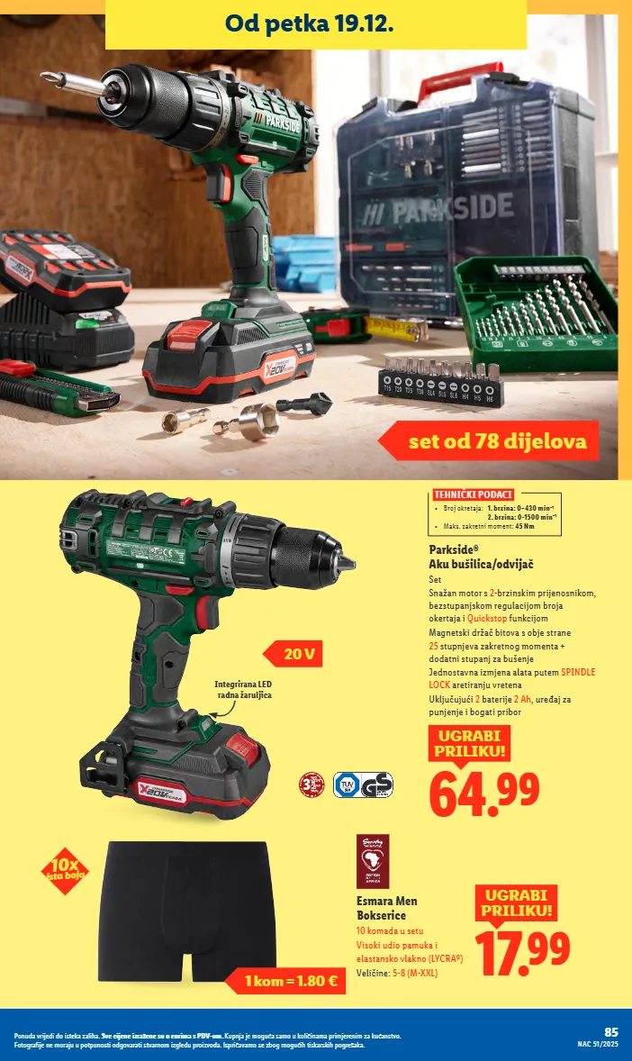 64.99 u grabi priliku! parkside® aku bušilica/odvijač set snažan motor s 2 -brzinskim prijenosnikom, bezstupanjskom regulacijom broja okertaja i quickstop funkcijom magnetski držač bitova s obje strane 25 stupnjeva zakretnog momenta + dodatni stupanj za bušenje jednostavna izmjena alata putem spindle lock aretiranju vretena uključujući 2 baterije 2 ah , uređaj za punjenje i bogati pribor 17.99 u grabi priliku! esmara m en bokserice 10 komada u setu visoki udio pamuka i elastansko vlakno (lycra®) veličine: 5-8 (m-xxl) integrirana led radna žaruljica tehnički podaci • broj okretaja: 1. brzina: 0–430 min –1 2. brzina: 0-1500 min –1 • maks. zakretni moment: 45 nm 20 v od petka 19.12. 85 nac 36/2025 ponuda vrijedi do isteka zaliha. sve cijene izražene su u eurima s pdv-om. kupnja je moguća samo u količinama primjerenim za kućanstvo. fotografije ne moraju u potpunosti odgovarati stvarnom izgledu proizvoda. ispričavamo se zbog mogućih tiskarskih pogrešaka. 1 kom = 1.80 € set od 78 dijelova 10x ista boja 85 nac 51/2025 ponuda vrijedi do isteka zaliha. sve cijene izražene su u eurima s pdv-om. kupnja je moguća samo u količinama primjerenim za kućanstvo. fotografije ne moraju u potpunosti odgovarati stvarnom izgledu proizvoda. ispričavamo se zbog mogućih tiskarskih pogrešaka.
