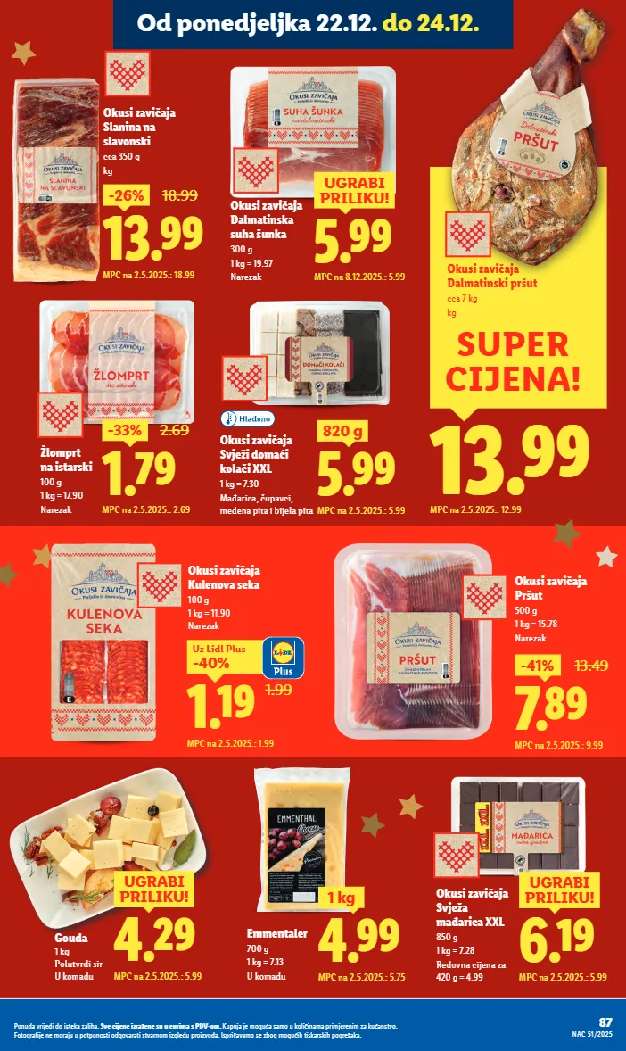 emmentaler 700 g 1 kg = 7.13 u komadu 4.99 1 kg mpc na 2.5.2025.: 5.75 6.19 ugrabi priliku! mpc na 2.5.2025.: 5.99 okusi zavičaja svježa mađarica xxl 850 g 1 kg = 7.28 redovna cijena za 420 g = 4.99 4.29 ugrabi priliku! mpc na 2.5.2025.: 5.99 gouda 1 kg polutvrdi sir u komadu 13.99 mpc na 2.5.2025.: 12.99 super cijena! okusi zavičaja dalmatinski pršut cca 7 kg kg okusi zavičaja pršut 500 g 1 kg = 15.78 narezak 7.89 -41% 13.49 mpc na 2.5.2025.: 9.99 1.99 1.19 -40% uz lidl plus mpc na 2.5.2025.: 1.99 okusi zavičaja kulenova seka 100 g 1 kg = 11.90 narezak 5.99 820 g mpc na 2.5.2025.: 5.99 okusi zavičaja svježi domaći kolači xxl 1 kg = 7.30 mađarica, čupavci, medena pita i bijela pita 5.99 ugrabi priliku! mpc na 8.12.2025.: 5.99 okusi zavičaja dalmatinska suha šunka 300 g 1 kg = 19.97 narezak 13.99 -26% 18.99 mpc na 2.5.2025.: 18.99 okusi zavičaja slanina na slavonski cca 350 g kg 1.79 -33% 2.69 mpc na 2.5.2025.: 2.69 žlomprt na istarski 100 g 1 kg = 17.90 narezak 87 nac 51/2025 ponuda vrijedi do isteka zaliha. sve cijene izražene su u eurima s pdv-om. kupnja je moguća samo u količinama primjerenim za kućanstvo. fotografije ne moraju u potpunosti odgovarati stvarnom izgledu proizvoda. ispričavamo se zbog mogućih tiskarskih pogrešaka. od ponedjeljka 22.12. do 24.12.