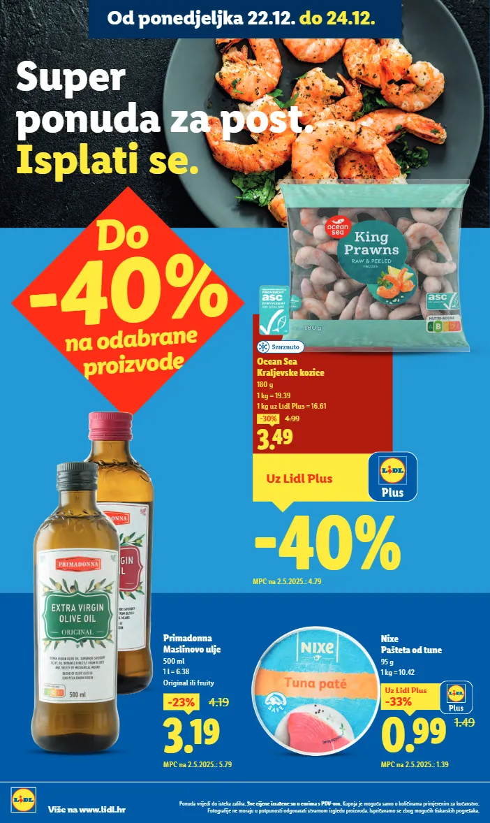 super ponuda za post. isplati se. primadonna maslinovo ulje 500 ml 1 l = 6.38 original ili fruity 3.19 -23% 4.19 mpc na 2.5.2025.: 5.79 do -40% na odabrane proizvode uz lidl plus -40% mpc na 2.5.2025.: 4.79 3.49 -30% 4.99 ocean sea kraljevske kozice 180 g 1 kg = 19.39 1 kg uz lidl plus = 16.61 1.49 0.99 -33% uz lidl plus mpc na 2.5.2025.: 1.39 nixe pašteta od tune 95 g 1 kg = 10.42 ponuda vrijedi do isteka zaliha. sve cijene izražene su u eurima s pdv-om. kupnja je moguća samo u količinama primjerenim za kućanstvo. fotografije ne moraju u potpunosti odgovarati stvarnom izgledu proizvoda. ispričavamo se zbog mogućih tiskarskih pogrešaka. više na www.lidl.hr od ponedjeljka 22.12. do 24.12.