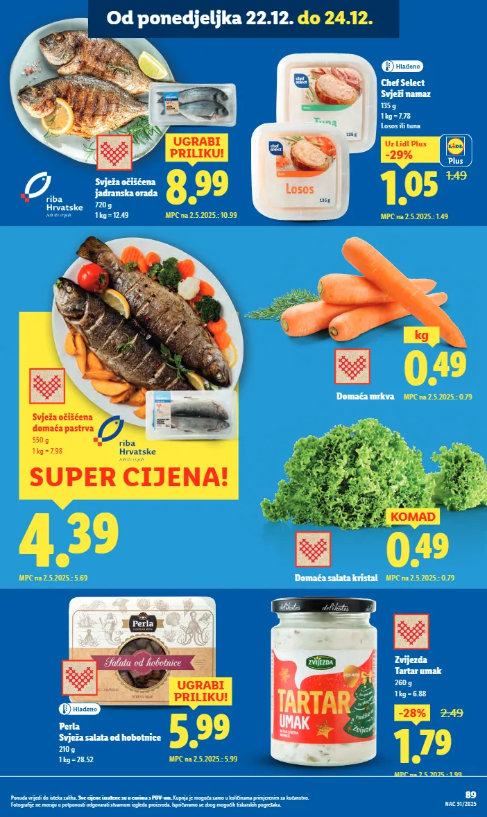 4.39 mpc na 2.5.2025.: 5.69 super cijena! svježa očišćena domaća pastrva 550 g 1 kg = 7.98 zvijezda tartar umak 260 g 1 kg = 6.88 5.99 ugrabi priliku! mpc na 2.5.2025.: 5.99 perla svježa salata od hobotnice 210 g 1 kg = 28.52 1.49 1.05 -29% uz lidl plus mpc na 2.5.2025.: 1.49 chef select svježi namaz 135 g 1 kg = 7.78 losos ili tuna 1.79 -28% 2.49 mpc na 2.5.2025.: 1.99 8.99 ugrabi priliku! mpc na 2.5.2025.: 10.99 svježa očišćena jadranska orada 720 g 1 kg = 12.49 domaća salata kristal 0.49 komad mpc na 2.5.2025.: 0.79 domaća mrkva 0.49 kg mpc na 2.5.2025.: 0.79 89 nac 51/2025 ponuda vrijedi do isteka zaliha. sve cijene izražene su u eurima s pdv-om. kupnja je moguća samo u količinama primjerenim za kućanstvo. fotografije ne moraju u potpunosti odgovarati stvarnom izgledu proizvoda. ispričavamo se zbog mogućih tiskarskih pogrešaka. od ponedjeljka 22.12. do 24.12.