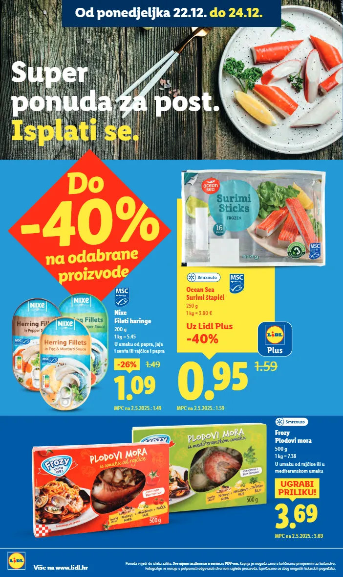 Super ponuda za post. Isplati se. Uz Lidl Plus -40% 0.95 1.59 Ocean Sea Surimi štapići 250 g 1 kg = 3.80 € MPC na 2.5.2025.: 1.59 3.69 UGRABI PRILIKU! MPC na 2.5.2025.: 3.69 Frozy Plodovi mora 500 g 1 kg = 7.38 U umaku od rajčice ili u mediteranskom umaku 1.09 -26% 1.49 MPC na 2.5.2025.: 1.49 Nixe Fileti haringe 200 g 1 kg = 5.45 U umaku od papra, jaja i senfa ili rajčice i papra Do -40% na odabrane proizvode Ponuda vrijedi do isteka zaliha. Sve cijene izražene su u eurima s PDV-om. Kupnja je moguća samo u količinama primjerenim za kućanstvo. Fotografije ne moraju u potpunosti odgovarati stvarnom izgledu proizvoda. Ispričavamo se zbog mogućih tiskarskih pogrešaka. Više na www.lidl.hr Od ponedjeljka 22.12. do 24.12.