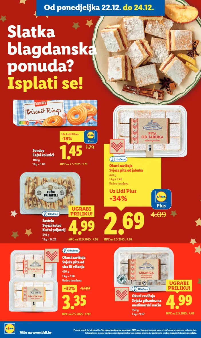 1.79 1.45 -18% uz lidl plus mpc na 2.5.2025.: 1.79 sondey čajni kolutići 400 g 1 kg = 3.63 sastela svježi kolač kućni prijatelj 350 g 1 kg = 14.26 4.99 ugrabi priliku! mpc na 22.9.2025.: 4.99 4.99 ugrabi priliku! mpc na 2.5.2025.: 4.69 okusi zavičaja svježa gibanica na međimurski način 550 g 1 kg = 9.07 3.35 -32% 4.99 mpc na 2.5.2025.: 4.99 okusi zavičaja svježa pita od sira ili višanja 420 g 1 kg = 7.98 ručno izrađena uz lidl plus -34% 2.69 4.09 okusi zavičaja svježa pita od jabuka 420 g 1 kg = 6.40 ručno izrađena mpc na 2.5.2025.: 4.09 slatka blagdanska ponuda? isplati se! ponuda vrijedi do isteka zaliha. sve cijene izražene su u eurima s pdv-om. kupnja je moguća samo u količinama primjerenim za kućanstvo. fotografije ne moraju u potpunosti odgovarati stvarnom izgledu proizvoda. ispričavamo se zbog mogućih tiskarskih pogrešaka. više na www.lidl.hr od ponedjeljka 22.12. do 24.12.