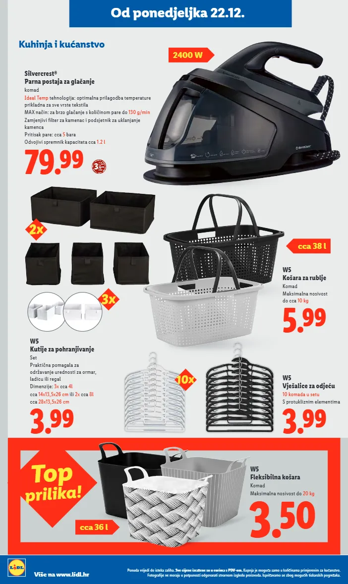 3.99 w5 vješalice za odjeću 10 komada u setu s protukliznim elementima 5.99 w5 košara za rublje komad maksimalna nosivost do cca 10 kg 10x od ponedjeljka 22.12. kuhinja i kućanstvo od ponedjeljka 22.12. 3.99 w5 kutije za pohranjivanje set praktična pomagala za održavanje urednosti za ormar, ladicu ili regal dimenzije: 3x cca 4l cca 14x13,5x26 cm ili 2x cca 8l cca 28x13,5x26 cm 2x 3x cca 38 l 79.99 silvercrest® parna postaja za glačanje komad ideal temp tehnologija: optimalna prilagodba temperature prikladna za sve vrste tekstila max način: za brzo glačanje s količinom pare do 130 g/min zamjenjivi filter za kamenac i podsjetnik za uklanjanje kamenca pritisak pare: cca 5 bara odvojivi spremnik kapaciteta cca 1.2 l top prilika ! w5 fleksibilna košara komad maksimalna nosivost do 20 kg 3.50 2400 w cca 36 l ponuda vrijedi do isteka zaliha. sve cijene izražene su u eurima s pdv-om. kupnja je moguća samo u količinama primjerenim za kućanstvo. fotografije ne moraju u potpunosti odgovarati stvarnom izgledu proizvoda. ispričavamo se zbog mogućih tiskarskih pogrešaka. više na www.lidl.hr