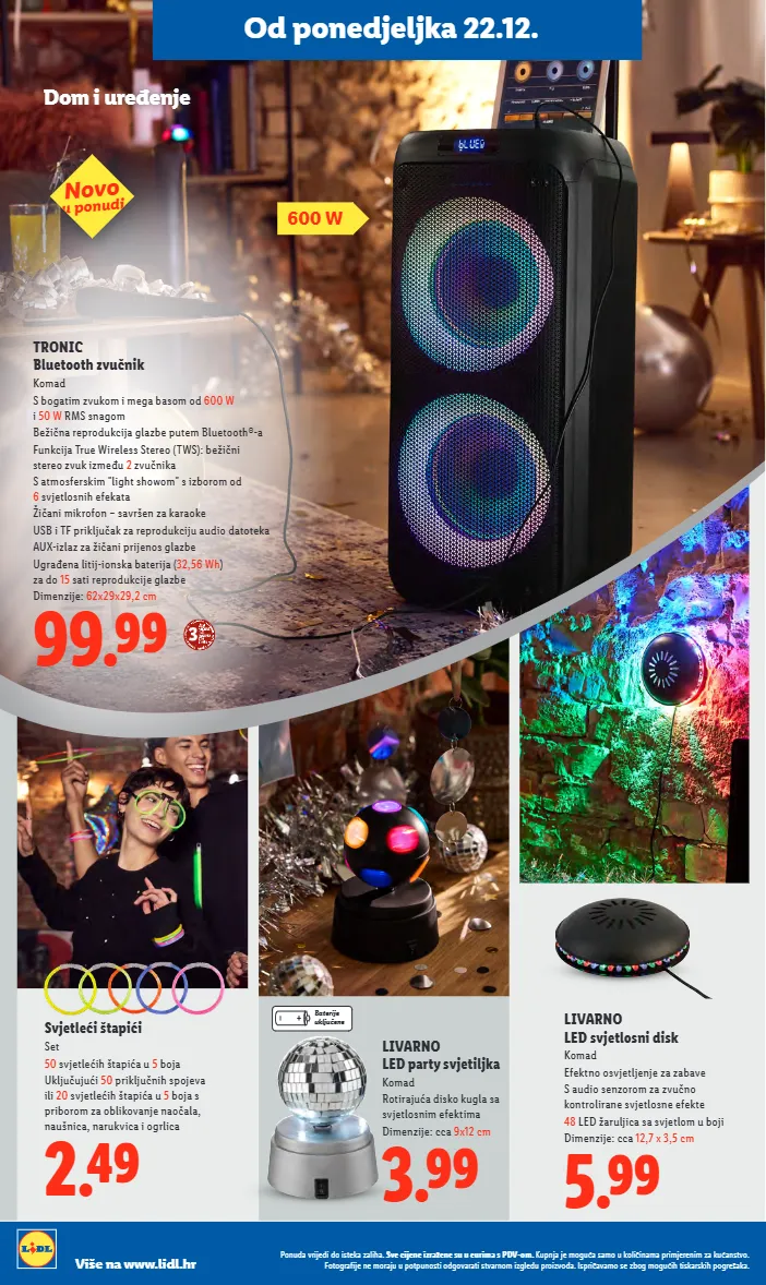 od ponedjeljka 22.12. 3.99 livarno led party svjetiljka komad rotirajuća disko kugla sa svjetlosnim efektima dimenzije: cca 9x12 cm 2.49 svjetleći štapići set 50 svjetlećih štapića u 5 boja uključujući 50 priključnih spojeva ili 20 svjetlećih štapića u 5 boja s priborom za oblikovanje naočala, naušnica, narukvica i ogrlica 99.99 tronic bluetooth zvučnik komad s bogatim zvukom i mega basom od 600 w i 50 w rms snagom bežična reprodukcija glazbe putem bluetooth®-a funkcija true wireless stereo (tws): bežični stereo zvuk između 2 zvučnika s atmosferskim "light showom" s izborom od 6 svjetlosnih efekata žičani mikrofon – savršen za karaoke usb i tf priključak za reprodukciju audio datoteka aux-izlaz za žičani prijenos glazbe ugrađena litij-ionska baterija ( 32,56 wh ) za do 15 sati reprodukcije glazbe dimenzije: 62x29x29,2 cm 5.99 livarno led svjetlosni disk komad efektno osvjetljenje za zabave s audio senzorom za zvučno kontrolirane svjetlosne efekte 48 led žaruljica sa svjetlom u boji dimenzije: cca 12,7 x 3,5 cm od ponedjeljka 22.12. dom i uređenje 600 w novo u ponudi baterije uključene ponuda vrijedi do isteka zaliha. sve cijene izražene su u eurima s pdv-om. kupnja je moguća samo u količinama primjerenim za kućanstvo. fotografije ne moraju u potpunosti odgovarati stvarnom izgledu proizvoda. ispričavamo se zbog mogućih tiskarskih pogrešaka. više na www.lidl.hr