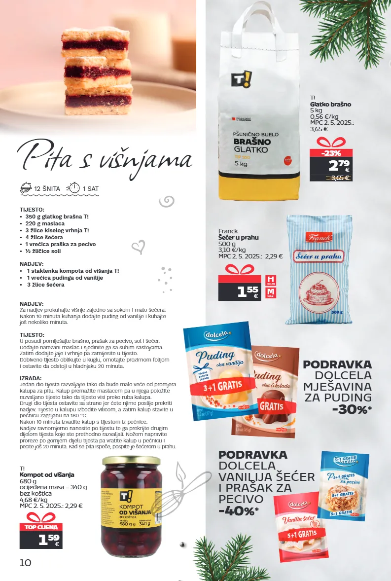 10 top cijena 1 59 € t! kompot od višanja 680 g ocijeđena masa = 340 g bez koštica 4,68 €/kg mpc 2. 5. 2025.: 2,29 € podravka dolcela vanilija šećer i prašak za pecivo -40 % * pita s višnjama nadjev: za nadjev prokuhajte višnje zajedno sa sokom i malo šećera. nakon 10 minuta kuhanja dodajte puding od vanilije i kuhajte još nekoliko minuta. tijesto: u posudi pomiješajte brašno, prašak za pecivo, sol i šećer. dodajte narezani maslac i sjedinite ga sa suhim sastojcima. zatim dodajte jaje i vrhnje pa zamijesite u tijesto. dobiveno tijesto oblikujte u kuglu, omotajte prozirnom folijom i ostavite da odstoji u hladnjaku 20 minuta. izrada: jedan dio tijesta razvaljajte tako da bude malo veće od promjera kalupa za pitu. kalup premažite maslacem pa u njega položite razvaljano tijesto tako da tijesto visi preko ruba kalupa. drugi dio tijesta ostavite sa strane jer ćete njime poslije prekriti nadjev. tijesto u kalupu izbodite vilicom, a zatim kalup stavite u pećnicu zagrijanu na 180 °c. nakon 10 minuta izvadite kalup s tijestom iz pećnice. nadjev ravnomjerno nanesite po tijestu te ga prekrijte drugim dijelom tijesta koje ste prethodno razvaljali. nožem napravite proreze po gornjem dijelu tijesta pa vratite kalup u pećnicu i pecite još 20 minuta. kad se pita ispeče, pospite je šećerom u prahu. 12 šnita 1 sat tijesto: • 350 g glatkog brašna t! • 220 g maslaca • 3 žlice kiselog vrhnja t! • 4 žlice šećera • 1 vrećica praška za pecivo • ½ žličice soli nadjev: • 1 staklenka kompota od višanja t! • 1 vrećica pudinga od vanilije • 3 žlice šećera t! glatko brašno 5 kg 0,56 €/kg mpc 2. 5. 2025.: 3,65 € -23% 2 79 € 3,65 € 1 55 € franck šećer u prahu 500 g 3,10 €/kg mpc 2. 5. 2025.: 2,29 € podravka dolcela mješavina za puding -30 % *