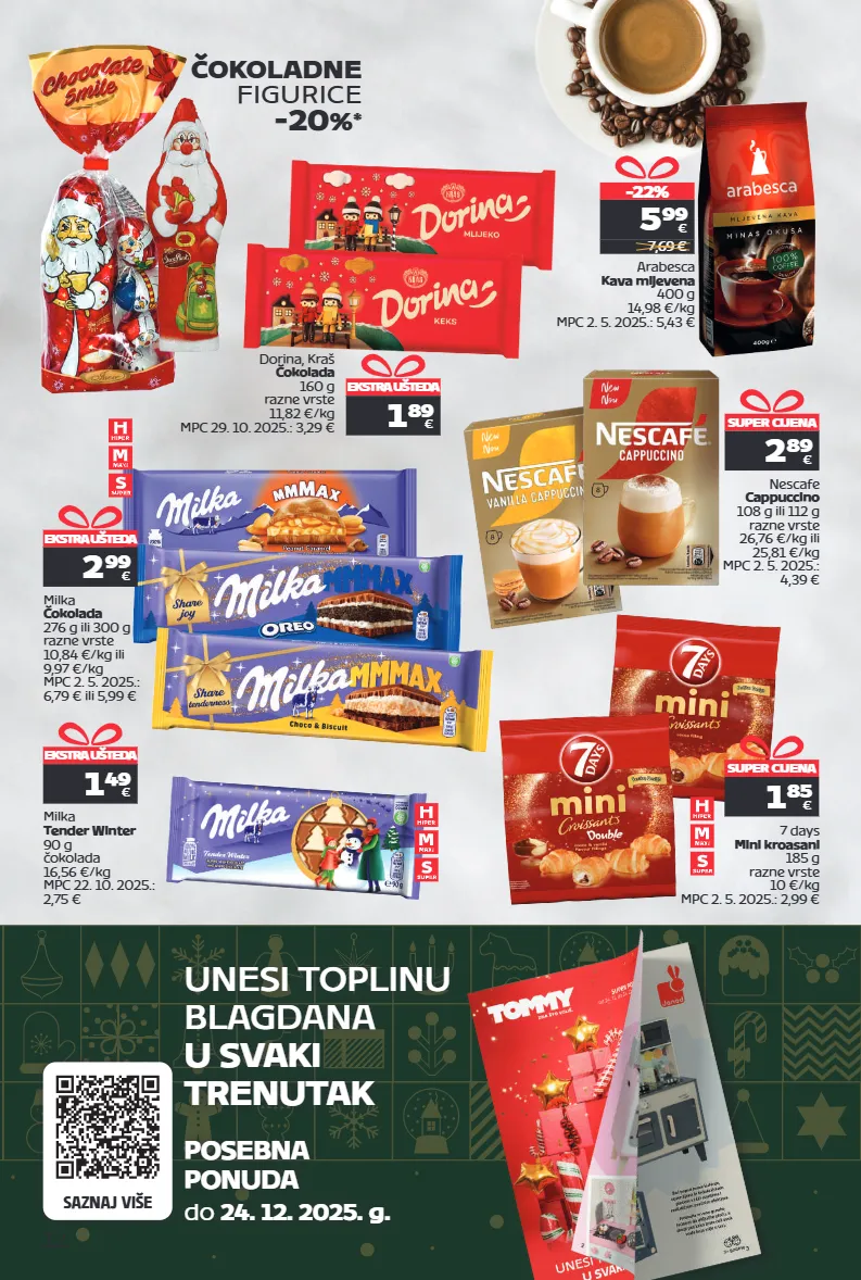 12 posebna ponuda do 24. 12. 2025. g. saznaj više unesi toplinu blagdana u svaki trenutak super cijena 2 89 € nescafe cappuccino 108 g ili 112 g razne vrste 26,76 €/kg ili 25,81 €/kg mpc 2. 5. 2025.: 4,39 € arabesca kava mljevena 400 g 14,98 €/kg mpc 2. 5. 2025.: 5,43 € -22% 5 99 € 7,69 € čokoladne figurice -20 % * ekstra ušteda 2 99 € milka čokolada 276 g ili 300 g razne vrste 10,84 €/kg ili 9,97 €/kg mpc 2. 5. 2025.: 6,79 € ili 5,99 € dorina, kraš čokolada 160 g razne vrste 11,82 €/kg mpc 29. 10. 2025.: 3,29 € 1 89 € ekstra ušteda milka tender winter 90 g čokolada 16,56 €/kg mpc 22. 10. 2025.: 2,75 € 1 49 € ekstra ušteda 7 days mini kroasani 185 g razne vrste 10 €/kg mpc 2. 5. 2025.: 2,99 € 1 85 € super cijena
