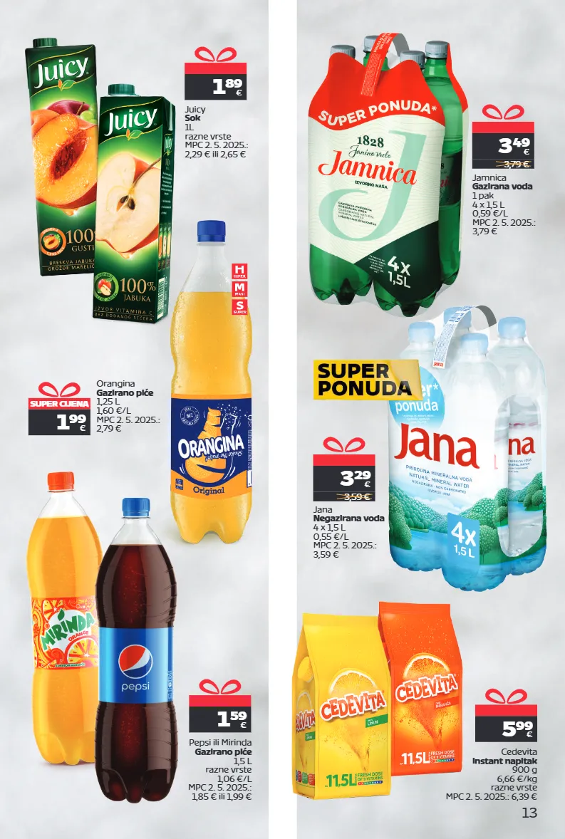 13 1 59 € pepsi ili mirinda gazirano piće 1,5 l razne vrste 1,06 €/l mpc 2. 5. 2025.: 1,85 € ili 1,99 € 5 99 € cedevita instant napitak 900 g 6,66 €/kg razne vrste mpc 2. 5. 2025.: 6,39 € 1 89 € juicy sok 1l razne vrste mpc 2. 5. 2025.: 2,29 € ili 2,65 € super cijena 1 99 € orangina gazirano piće 1,25 l 1,60 €/l mpc 2. 5. 2025.: 2,79 € jamnica gazirana voda 1 pak 4 x 1,5 l 0,59 €/l mpc 2. 5. 2025.: 3,79 € 3 49 € 3,79 € jana negazirana voda 4 x 1,5 l 0,55 €/l mpc 2. 5. 2025.: 3,59 € 3 29 € 3,59 €
