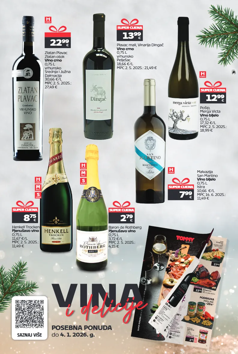 15 posebna ponuda do 4. 1. 2026. g. saznaj više super cijena 2 79 € baron de rothberg pjenušavo vino 0,75 l 3,72 €/l mpc 2. 5. 2025.: 4,15 € super cijena 8 75 € henkell trocken pjenušavo vino 0,75 l 11,67 €/l mpc 2. 5. 2025.: 11,49 € super cijena 7 99 € malvazija san martino vino bijelo 0,75 l istra 10,66 €/l mpc 14. 6. 2025.: 11,49 € 22 99 € zlatan plavac zlatan otok vino crno 0,75 l vrhunsko srednja i južna dalmacija 30,66 €/l mpc 2. 5. 2025.: 27,49 € super cijena 1399 € plavac mali, vinarija dingač vino crno 0,75 l vrhunsko pelješac 18,66 €/l mpc 2. 5. 2025.: 21,49 € super cijena 12 99 € pošip, merga victa vino bijelo 0,75 l 17,32 €/l mpc 2. 5. 2025.: 18,99 €