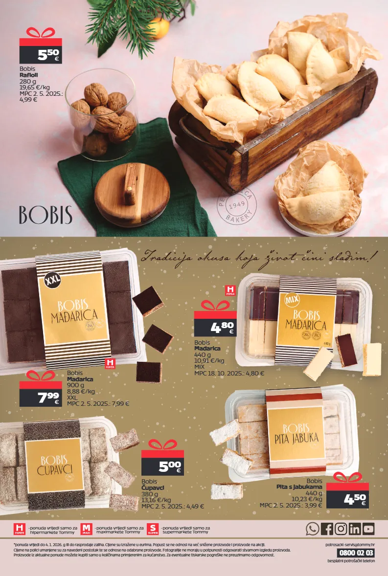 -ponuda vrijedi samo za maximarkete Tommy -ponuda vrijedi samo za hipermarkete Tommy 0800 02 03 *ponuda vrijedi do 4. 1. 2026. g ili do rasprodaje zaliha. Cijene su izražene u eurima. Popust se ne odnosi na već snižene proizvode i proizvode na akciji. Cijene na polici umanjene su za navedeni postotak te se odnose na odabrane proizvode. Fotografije ne moraju u potpunosti odgovarati stvarnom izgledu proizvoda. Proizvode iz aktualne ponude možete kupiti samo u količinama primjerenim za kućanstvo. Za eventualne tiskarske pogreške ne preuzimamo odgovornost. besplatni potrošački telefon potrosacki-servis@tommy.hr 5 50 € Bobis Rafioli 280 g 19,65 €/kg MPC 2. 5. 2025.: 4,99 € 4 80 € Bobis Mađarica 440 g 10,91 €/kg MIX MPC 18. 10. 2025.: 4,80 € 4 50 € Bobis Pita s jabukama 440 g 10,23 €/kg MPC 2. 5. 2025.: 3,99 € 5 00 € Bobis Čupavci 380 g 13,16 €/kg MPC 2. 5. 2025.: 4,49 € 7 99 € Bobis Mađarica 900 g 8,88 €/kg XXL MPC 2. 5. 2025.: 7,99 € -ponuda vrijedi samo za supermarkete Tommy