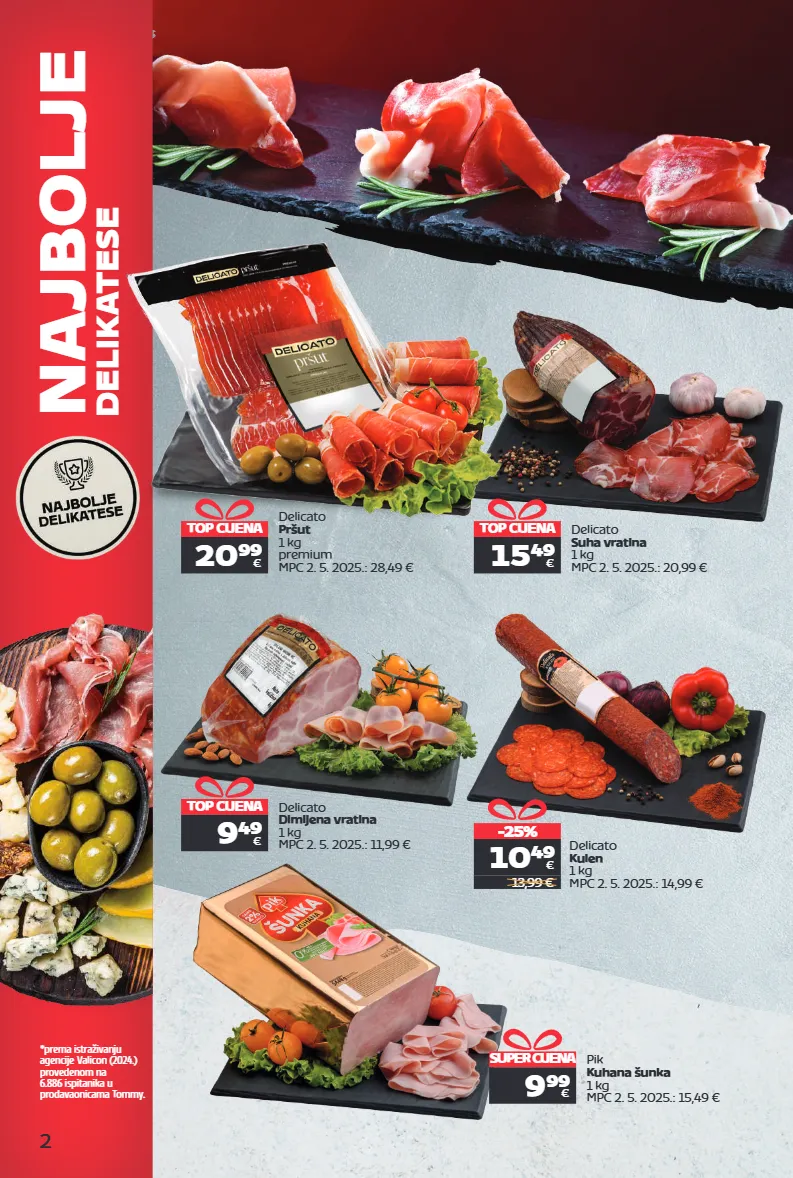 najbolje delikatese *prema istraživanju agencije valicon (2024.) provedenom na 6.886 ispitanika u prodavaonicama tommy. 2 2 top cijena 15 49 € delicato suha vratina 1 kg mpc 2. 5. 2025.: 20,99 € delicato kulen 1 kg mpc 2. 5. 2025.: 14,99 € -25% 10 49 € 13,99 € super cijena 9 99 € pik kuhana šunka 1 kg mpc 2. 5. 2025.: 15,49 € top cijena 20 99 € delicato pršut 1 kg premium mpc 2. 5. 2025.: 28,49 € delicato dimljena vratina 1 kg mpc 2. 5. 2025.: 11,99 € top cijena 9 49 €