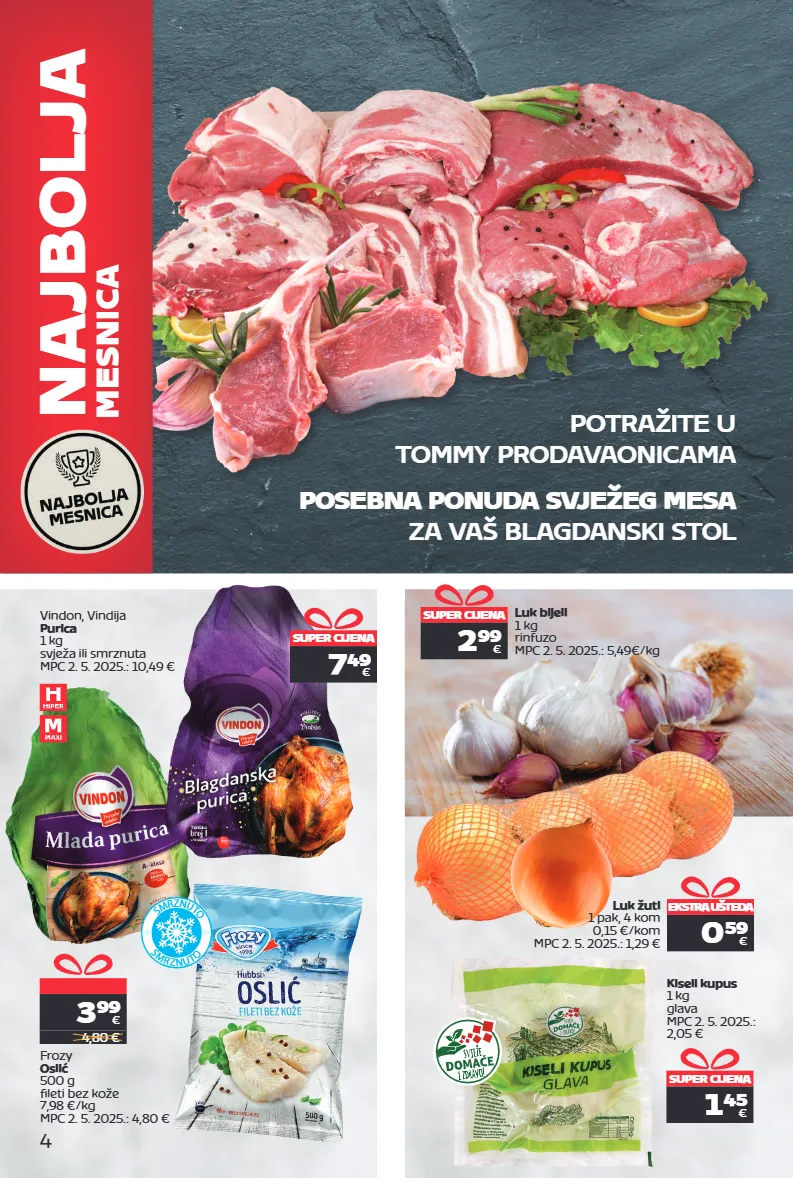 potražite u tommy prodavaonicama posebna ponuda svježeg mesa za vaš blagdanski stol 4 frozy oslić 500 g fileti bez kože 7,98 €/kg mpc 2. 5. 2025.: 4,80 € najbolja mesnica super cijena 1 45 € kiseli kupus 1 kg glava mpc 2. 5. 2025.: 2,05 € super cijena 2 99 € luk bijeli 1 kg rinfuzo mpc 2. 5. 2025.: 5,49€/kg ekstra ušteda 0 59 € luk žuti 1 pak, 4 kom 0,15 €/kom mpc 2. 5. 2025.: 1,29 € s m r z n u t o s m r z n u t o vindon, vindija purica 1 kg svježa ili smrznuta mpc 2. 5. 2025.: 10,49 € super cijena 7 49 € 3 99 € 4,80 €