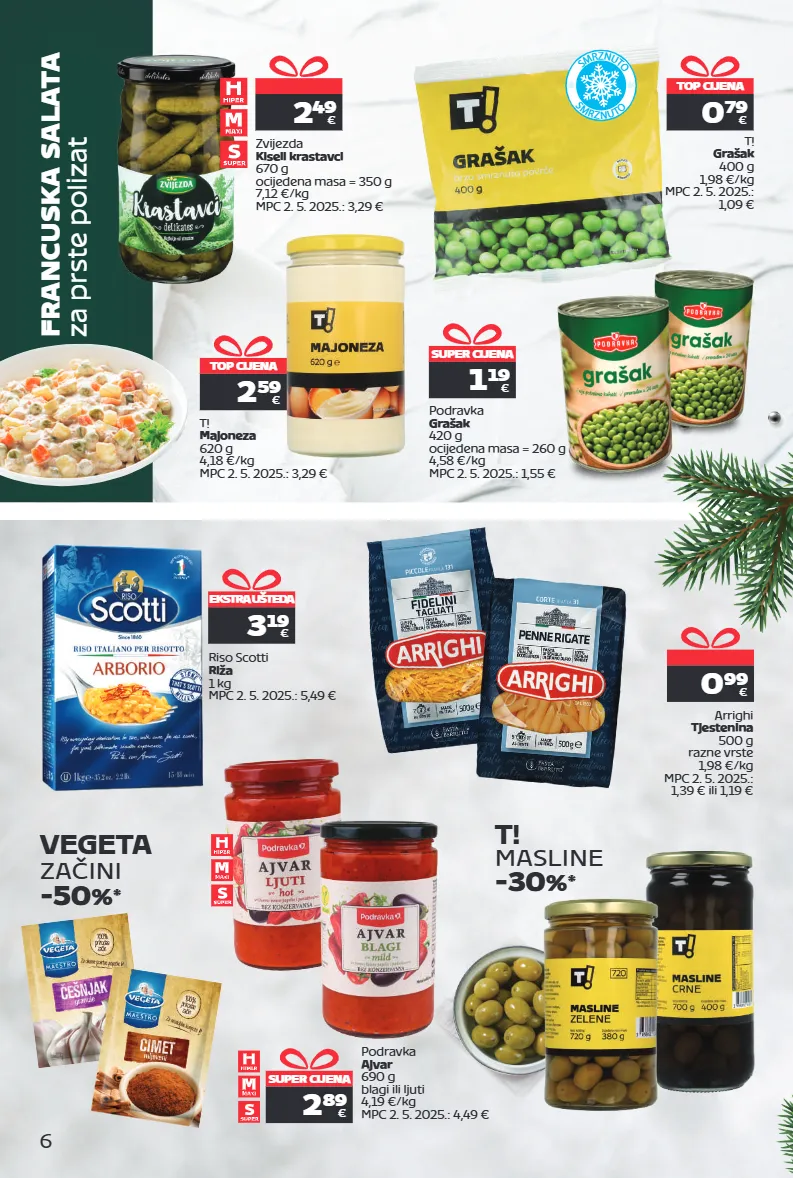 ekstra ušteda 3 19 € riso scotti riža 1 kg mpc 2. 5. 2025.: 5,49 € super cijena 2 89 € podravka ajvar 690 g blagi ili ljuti 4,19 €/kg mpc 2. 5. 2025.: 4,49 € t! masline -30 % * vegeta začini -50 % * 6 super cijena 1 19 € podravka grašak 420 g ocijeđena masa = 260 g 4,58 €/kg mpc 2. 5. 2025.: 1,55 € 0 99 € arrighi tjestenina 500 g razne vrste 1,98 €/kg mpc 2. 5. 2025.: 1,39 € ili 1,19 € s m r z n u t o s m r z n u t o top cijena 0 79 € t! grašak 400 g 1,98 €/kg mpc 2. 5. 2025.: 1,09 € 2 49 € zvijezda kiseli krastavci 670 g ocijeđena masa = 350 g 7,12 €/kg mpc 2. 5. 2025.: 3,29 € francuska salata za prste polizat top cijena 2 59 € t! majoneza 620 g 4,18 €/kg mpc 2. 5. 2025.: 3,29 €