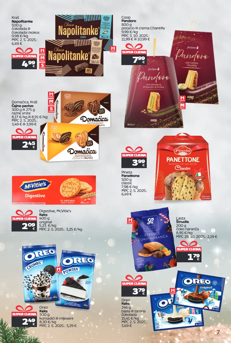 7 super cijena 2 09 € digestive, mcvitie’s keks 400 g original 5,23 €/kg mpc 2. 5. 2025.: 3,25 €/kg kraš napolitanke 500 g čokolada ili čokolada i kokos 9,98 €/kg mpc 2. 5. 2025.: 6,69 € 4 99 € super cijena domaćica, kraš čajno pecivo 300 g ili 275 g razne vrste 8,17 €/kg ili 8,91 €/kg mpc 2. 5. 2025.: 3,49 € ili 3,99 € 2 45 € super cijena oreo keks 300 g komadići ili mljeveni 8,30 €/kg mpc 2. 5. 2025.: 3,29 € 2 49 € super cijena oreo keks 246 g bijela ili tamna čokolada 15,41 €/kg mpc 2. 5. 2025.: 3,69 € 3 79 € super cijena lasta štrudle 200 g čoko naranča 8,95 €/kg mpc 28. 10. 2025.: 2,19 € 1 79 € super cijena pineta panettone 500 g classic 7,98 €/kg mpc 2. 5. 2025.: 6,49 € 3 99 € super cijena coop pandoro 800 g pistacio ili crema chantilly 9,99 €/kg mpc 3. 10. 2025.: 11,99 € ili 10,99 € 7 99 € super cijena