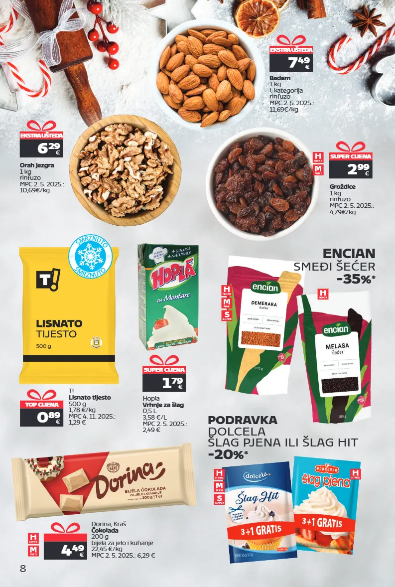 4 49 € dorina, kraš čokolada 200 g bijela za jelo i kuhanje 22,45 €/kg mpc 2. 5. 2025.: 6,29 € 8 super cijena 1 79 € hopla vrhnje za šlag 0,5 l 3,58 €/l mpc 2. 5. 2025.: 2,49 € top cijena 0 89 € t! lisnato tijesto 500 g 1,78 €/kg mpc 4. 11. 2025.: 1,29 € ekstra ušteda 6 29 € orah jezgra 1 kg rinfuzo mpc 2. 5. 2025.: 10,69€/kg s m r z n u t o s m r z n u t o ekstra ušteda 7 49 € badem 1 kg i. kategorija rinfuzo mpc 2. 5. 2025.: 11,69€/kg super cijena 2 99 € grožđice 1 kg rinfuzo mpc 2. 5. 2025.: 4,79€/kg encian smeđi šećer -35 % * podravka dolcela šlag pjena ili šlag hit -20 % *