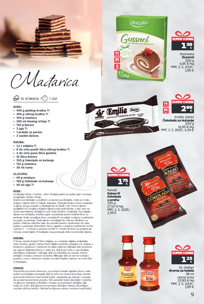 super cijena 1 39 € podravka gussnel 200 g 6,95 €/kg mpc 2. 5. 2025.: 1,89 € 9 super cijena 1 25 € dr. oetker aroma za kolače 38 ml razne vrste 32,90 €/kg mpc 2. 5. 2025.: 1,89 € mađarica kore: izmiksajte šećer i maslac, zatim dodajte jedno po jedno jaje i na kraju umiješajte i kiselo vrhnje. brašno pomiješajte s praškom za pecivo pa dodajite, malo po malo, smjesi s jajima dok to mikser dopušta. ostatak brašna ručno umijesite u tijesto pa ga ostavite u hladnjak da se hladi 1 sat. potom tijesto podijelite na 5 kuglica. kuglice tijesta malo pobrašnite, a ako vam se učine premekane, dodajte im još malo brašna i umijesite. razvaljajte tijesto na stolnjaku. izrežite papir za pečenje prema veličini lima za pečenje. kada razvaljate kore, zarolajte ih na valjak za tijesto i prebacite na papir za pečenje. sada tijesto razvaljajte do rubova, direktno na papiru. rubove odrežite tako da ostavite barem centimetar do ruba papira za pečenje slobodnim. koru zajedno s papirom prebacite na lim i pecite 5 - 7 minuta u pećnici na 190 °c. pazite da kore ne pregore jer moraju ostati bijele. ponavljajte ovaj postupak dok ne potrošite tijesto. krema: u lonac stavite kuhati 1 litru mlijeka, a u ostatak mlijeka umiješajte oštro brašno, gustin i šećer. kad mlijeko prokuha, dodajte mu smjesu s brašnom, gustinom i šećerom te cijelo vrijeme miksajte dok se krema ne zgusne. maknite kremu s vatre pa, dok je još vrela, u nju dodajte izlomljenu čokoladu i miksajte dok se čokolada ne rastopi. potom dodajte i maslac narezan na listiće. miksajte dok se sve ne rastopi i poveže. lonac s kremom stavite na neko hladno mjesto, ne mora biti u hladnjaku. izrada: premažite prvu koru kremom, a po kremi stavite sljedeću koru i tako redom ponavljajte postupak dok na vrhu ne ostane kora koju nećete premazati kremom. kad složite kolač, opteretite ga odozgo i ostavite da se premazane kore povežu. tek sutradan kolač glazirajte i narežite. za glazuru rastopite čokoladu i maslac pa postupno dodajite ulje, malo po malo, dok glazura ne postane dovoljno tekuća da je lijepo možete izliti po kolaču. tek kad se glazura stisne, možete rezati kolač. kore: • 400 g glatkog brašna t! • 400 g oštrog brašna t! • 250 g maslaca • 200 ml kiselog vrhnja t! • 130 g šećera • 3 jaja t! • 1 prašak za pecivo • 2 vanilin šećera krema: • 1,5 l mlijeka t! • 8 do vrha punih žlica oštrog brašna t! • 4 do vrha pune žlice gustina • 10 žlica šećera • 250 g čokolade za kuhanje • 125 g maslaca • 30 ml ruma glazura: • 50 g maslaca • 100 g čokolade za kuhanje • 50 ml ulja t! 16 komada 1 sat emilia, zainin čokolada za kuhanje 200 g 14,95 €/kg mpc 2. 5. 2025.: 4,39 € 2 99 € super cijena kandit kakao ili čokolada u prahu 100 g 17,50 €/kg mpc 2. 5. 2025.: 2,39 € 1 75 € super cijena