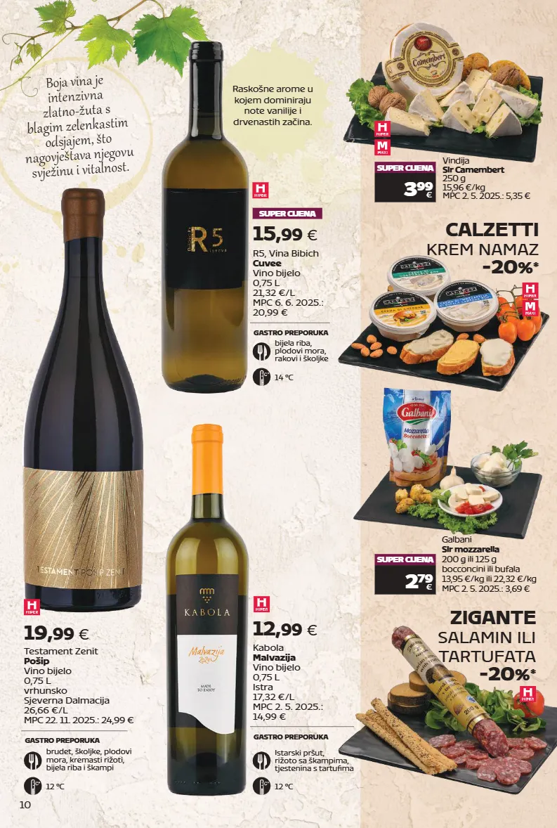 10 3 99 super cijena € vindija sir camembert 250 g 15,96 €/kg mpc 2. 5. 2025.: 5,35 € 2 79 super cijena € galbani sir mozzarella 200 g ili 125 g bocconcini ili bufala 13,95 €/kg ili 22,32 €/kg mpc 2. 5. 2025.: 3,69 € calzetti krem namaz -20 % * boja vina je intenzivna zlatno-žuta s blagim zelenkastim odsjajem, što nagovještava njegovu svježinu i vitalnost. raskošne arome u kojem dominiraju note vanilije i drvenastih začina. r5, vina bibich cuvee vino bijelo 0,75 l 21,32 €/l mpc 6. 6. 2025.: 20,99 € 15, 99 € super cijena gastro preporuka 14 °c bijela riba, plodovi mora, rakovi i školjke zigante salamin ili tartufata -20 % * testament zenit pošip vino bijelo 0,75 l vrhunsko sjeverna dalmacija 26,66 €/l mpc 22. 11. 2025.: 24,99 € 19, 99 € gastro preporuka 12 °c brudet, školjke, plodovi mora, kremasti rižoti, bijela riba i škampi kabola malvazija vino bijelo 0,75 l istra 17,32 €/l mpc 2. 5. 2025.: 14,99 € 12,99 € gastro preporuka 12 °c istarski pršut, rižoto sa škampima, tjestenina s tartufima