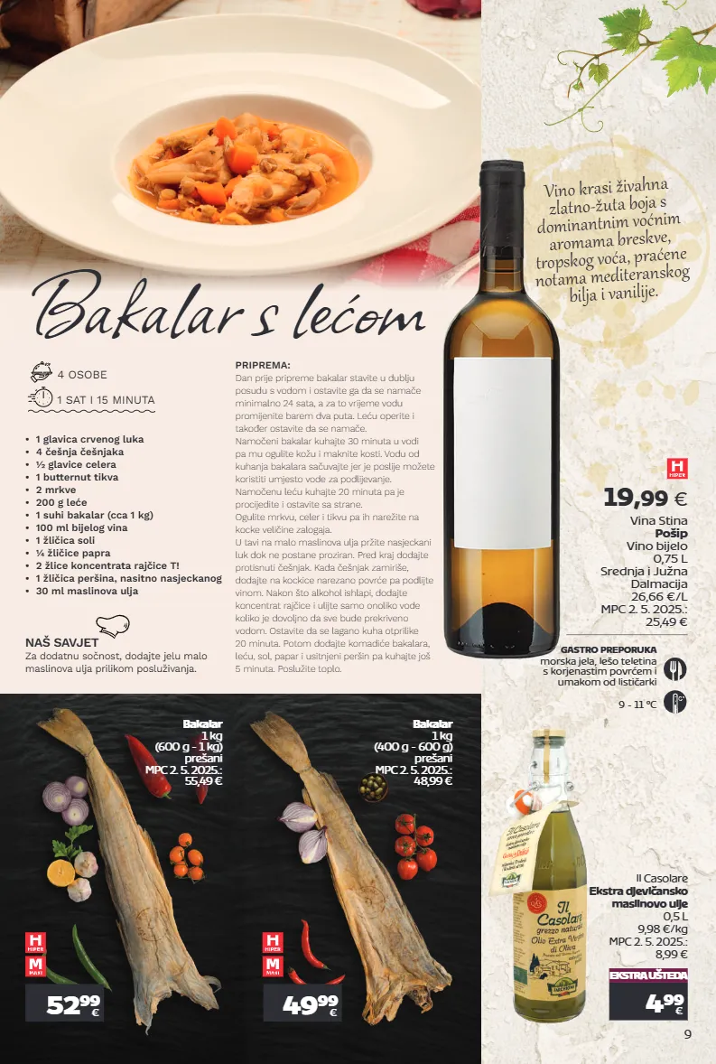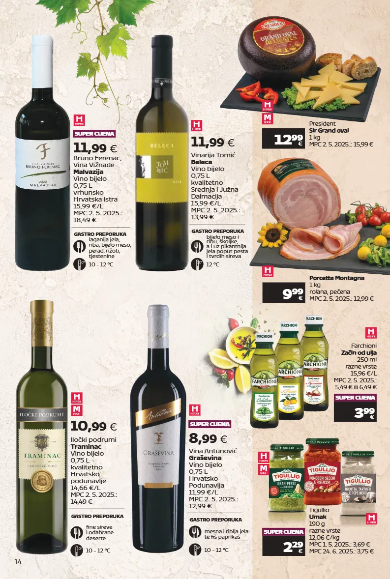 14 vinarija tomić beleca vino bijelo 0,75 l kvalitetno srednja i južna dalmacija 15,99 €/l mpc 2. 5. 2025.: 13,99 € 11, 99 € gastro preporuka 12 °c bijelo meso i ribu, školjke, a i uz pikantnija jela poput pesta i tvrdih sireva bruno ferenac, vina vižnade malvazija vino bijelo 0,75 l vrhunsko hrvatska istra 15,99 €/l mpc 2. 5. 2025.: 18,49 € 11, 99 € gastro preporuka 10 - 12 °c laganija jela, riba, bijelo meso, perad, rižoti, tjestenine super cijena vina antunović graševina vino bijelo 0,75 l hrvatsko podunavlja 11,99 €/l mpc 2. 5. 2025.: 12,99 € 8,99 € gastro preporuka 10 - 12 °c mesna i riblja jela te fiš paprikaš super cijena 12 99 € president sir grand oval 1 kg mpc 2. 5. 2025..: 15,99 € 2 29 € tigullio umak 190 g razne vrste 12,06 €/kg mpc 1. 5. 2025.: 3,69 € mpc 24. 6. 2025.: 3,75 € super cijena 9 99 € porcetta montagna 1 kg rolana, pečena mpc 2. 5. 2025.: 12,99 € iločki podrumi traminac vino bijelo 0,75 l kvalitetno hrvatsko podunavlje 14,66 €/l mpc 2. 5. 2025.: 14,49 € 10,99 € gastro preporuka 10 - 12 °c fine sireve i odabrane deserte super cijena farchioni začin od ulja 250 ml razne vrste 15,96 €/l mpc 2. 5. 2025.: 5,49 € ili 6,49 € 3 99 €