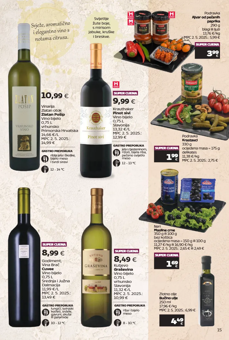 15 godiment, vina brač cuvee vino bijelo 0,75 l srednja i južna dalmacija 11,99 €/l mpc 2. 5. 2025.: 13,49 € 8, 99 € super cijena gastro preporuka 10 - 12 °c lungići, svinjski kotleti, srdele, gavuni, skuše ili palamide 4 49 € zlotno olje bučino ulje 250 ml 17,96 €/kg mpc 2. 5. 2025.: 6,99 € 1 99 super cijena € podravka krastavci 330 g ocijeđena masa = 175 g delikates 11,38 €/kg mpc 2. 5. 2025.: 2,75 € 1 69 super cijena € neri masline crne 350 g ili 100 g bez koštica ocijeđena masa = 150 g ili 100 g 11,27 €/kg ili 16,90 €/kg mpc 2. 5. 2025.: 2,65 € ili 2,49 € gastro preporuka 8 - 10 °c riba i bijelo meso kutjevo graševina vino bijelo 0,75 l vrhunsko slavonija 11,32 €/l mpc 2. 5. 2025.: 10,99 € 8,49 € super cijena svježe, aromatično i elegantno vino s notama citrusa. vinarija zlatan otok zlatan pošip vino bijelo 0,75 l vrhunsko primorska hrvatska 14,66 €/l mpc 2. 5. 2025.: 14,99 € 10, 99 € gastro preporuka 12 - 14 °c riblja jela i školjke, bijelo meso i tvrdi sirevi super cijena 399 € podravka ajvar od pečenih paprika 290 g blagi ili ljuti 13,76 €/kg mpc 2. 5. 2025.: 5,99 € svijetlije žute boje, s mirisom jabuke, kruške i breskve. krauthaker pinot sivi vino bijelo 0,75 l slavonija 13,32 €/l mpc 2. 5. 2025.: 12,99 € 9, 99 € super cijena gastro preporuka 12 - 13 °c jela s tjesteninom, rižoti, bijela riba, pečeno svijetlo meso