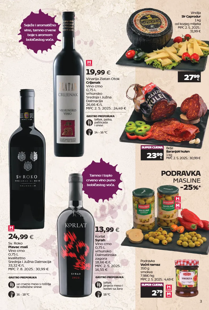 tamno i toplo crveno vino puno bobičastog voća. korlat syrah vino crno 0,75 l vrhunsko dalmatinska zagora 18,66 €/l mpc 2. 5. 2025.: 16,55 € 13, 99 € gastro preporuka 18 °c biftek, janjeće meso i kotleti sa žara 3 svježe i aromatično vino, tamno crvene boje s aromom bobičastog voća. vinarija zlatan otok crljenak vino crno 0,75 l vrhunsko srednja i južna dalmacija 26,66 €/l mpc 2. 5. 2025.: 24,49 € 19, 99 € gastro preporuka 14 - 16 °c biftek, patka, pašticada i sirevi 2 79 € podravka voćni namaz 350 g smokva 7,98€/kg mpc 2. 5. 2025.: 4,49 € super cijena sv. roko plavac mali vino crno 0,75 l kvalitetno srednja i južna dalmacija 33,32 €/l mpc 7. 8. 2025.: 30,99 € 24, 99 € gastro preporuka 16 - 18 °c uz crveno meso s roštilja te odležane sireve 27 99 € vindija sir caprodur 1 kg od kozjeg mlijeka mpc 2. 5. 2025.: 31,99 € podravka masline -25 % * belje baranjski kulen 1 kg mpc 2. 5. 2025.: 30,99 € 23 99 € super cijena