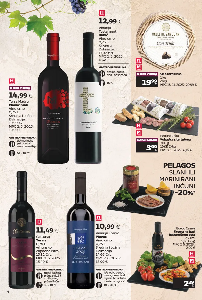 4 cattunar teran 0,75 l vrhunsko zapadna istra 15,32 €/l mpc 2. 5. 2025.: 15,49 € 11, 49 € gastro preporuka 16 - 18 °c meso sa žara, pršut, svježi i zreli sirevi, prženi inćuni pelagos slani ili marinirani inćuni -20 % * 3 99 € bokun gušta kobasica s tartufima 200 g 19,95 €/kg mpc 2. 5. 2025.: 6,49 € super cijena vinarija tomić plavac vino crno 0,75 l srednja i južna dalmacija 14,66 €/l mpc 7. 6. 2025.: 13,99 € 10, 99 € gastro preporuka 18 - 20 °c jela od crvenog mesa, umaci od rajčice, bruschete i sušene rajčice 19 99 € sir s tartufima 1 kg ovčji mpc 18. 11. 2025.: 29,99 € super cijena 2 29 € borgo casale krema na bazi balzamičnog octa 250 ml 9,16 €/kg mpc 2. 5. 2025.: 2,99 € vinarija testament babić vino crno 0,75 l sjeverna dalmacija 17,32 €/l mpc 2. 5. 2025.: 18,49 € 12,99 € gastro preporuka 16 °c divljač, patka, riba i pašticada terra madre plavac mali vino crno 0,75 l srednja i južna dalmacija 19,99 €/l mpc 2. 5. 2025.: 19,99 € 14, 99 € gastro preporuka 16 - 18 °c dalmatinska pašticada i meso sa roštilja super cijena