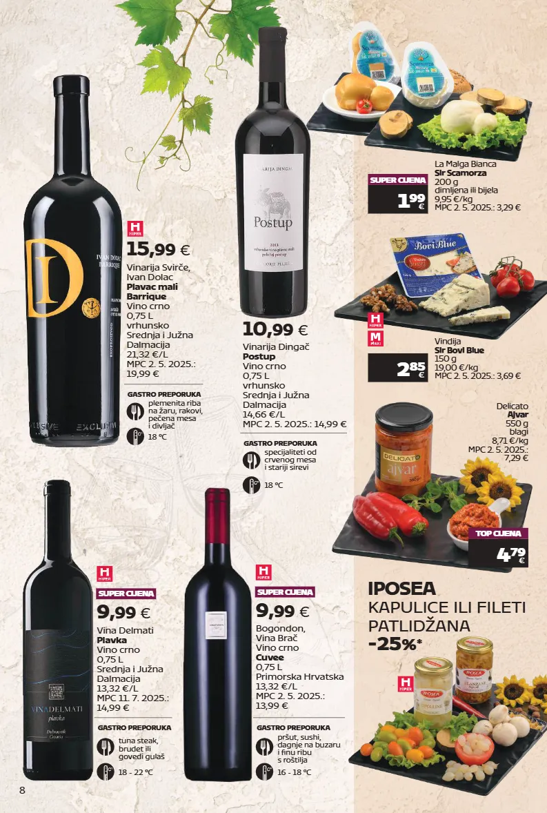 8 vina delmati plavka vino crno 0,75 l srednja i južna dalmacija 13,32 €/l mpc 11. 7. 2025.: 14,99 € 9,99 € gastro preporuka 18 - 22 °c tuna steak, brudet ili goveđi gulaš super cijena 1 99 super cijena € la malga bianca sir scamorza 200 g dimljena ili bijela 9,95 €/kg mpc 2. 5. 2025.: 3,29 € 2 85 € vindija sir bovi blue 150 g 19,00 €/kg mpc 2. 5. 2025.: 3,69 € iposea kapulice ili fileti patlidžana -25 % * 4 79 top cijena € delicato ajvar 550 g blagi 8,71 €/kg mpc 2. 5. 2025.: 7,29 € vinarija svirče, ivan dolac plavac mali barrique vino crno 0,75 l vrhunsko srednja i južna dalmacija 21,32 €/l mpc 2. 5. 2025.: 19,99 € 15, 99 € gastro preporuka 18 °c plemenita riba na žaru, rakovi, pečena mesa i divljač bogondon, vina brač vino crno cuvee 0,75 l primorska hrvatska 13,32 €/l mpc 2. 5. 2025.: 13,99 € 9, 99 € gastro preporuka 16 - 18 °c pršut, sushi, dagnje na buzaru i finu ribu s roštilja super cijena vinarija dingač postup vino crno 0,75 l vrhunsko srednja i južna dalmacija 14,66 €/l mpc 2. 5. 2025.: 14,99 € 10, 99 € gastro preporuka 18 °c specijaliteti od crvenog mesa i stariji sirevi