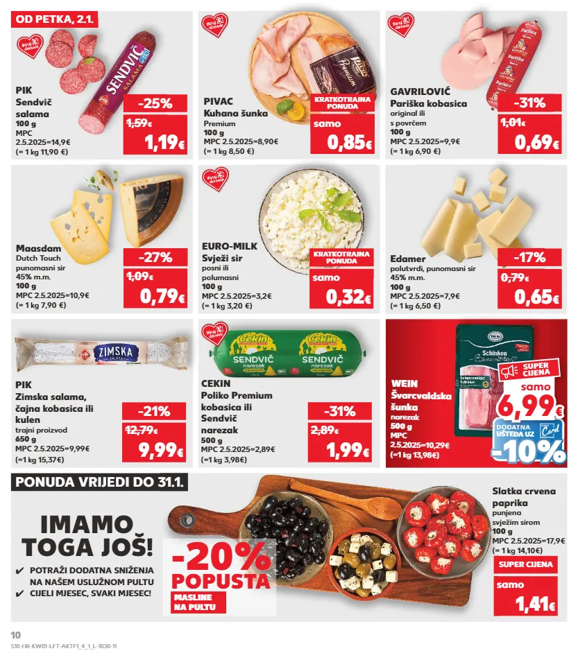 kratkotrajna ponuda kratkotrajna ponuda kratkotrajna ponuda kratkotrajna ponuda kratkotrajna ponuda kratkotrajna ponuda kratkotrajna ponuda od petka, 2.1. ponuda vrijedi do 31.1. masline na pultu -20% popusta ✓ potraži dodatna sniženja na našem uslužnom pultu ✓ cijeli mjesec, svaki mjesec! imamo toga još! maasdam dutch touch punomasni sir 45% m.m. 100 g mpc 2.5.2025=10,9€ (= 1 kg 7,90 €) pik zimska salama, čajna kobasica ili kulen trajni proizvod 650 g mpc 2.5.2025=9,99€ (=1 kg 15,37€) cekin poliko premium kobasica ili sendvič narezak 500 g mpc 2.5.2025=2,89€ (=1 kg 3,98€) euro-milk svježi sir posni ili polumasni 100 g mpc 2.5.2025=3,2€ (= 1 kg 3,20 €) kratkotrajna ponuda samo 0,32 € slatka crvena paprika punjena svježim sirom 100 g mpc 2.5.2025=17,9€ (= 1 kg 14,10€) samo super cijena 1,41 € -27% 0,79 € 1,09 € -21% 9,99 € 12,79 € -31% 1,99 € 2,89 € gavrilović pariška kobasica original ili s povrćem 100 g mpc 2.5.2025=9,9€ (= 1 kg 6,90 €) -31% 0,69 € 1,01 € -17% 0,65 € 0,79 € (= 1 kg 6,50 €) edamer polutvrdi, punomasni sir 45% m.m. 100 g mpc 2.5.2025=7,9€ -25% 1,19 € 1,59 € (= 1 kg 11,90 €) pik sendvič salama 100 g mpc 2.5.2025=14,9€ kratkotrajna ponuda samo 0,85 € (= 1 kg 8,50 €) pivac kuhana šunka premium 100 g mpc 2.5.2025=8,90€ (=1 kg 13,98€) wein švarcvaldska šunka narezak 500 g mpc 2.5.2025=10,29€ dodatna ušteda uz - - 10% 10% dodatna 6,99 6,99 € € samo super cijena s10-hr-kw01-lft-aktf1_4_1_l-1030-11 10