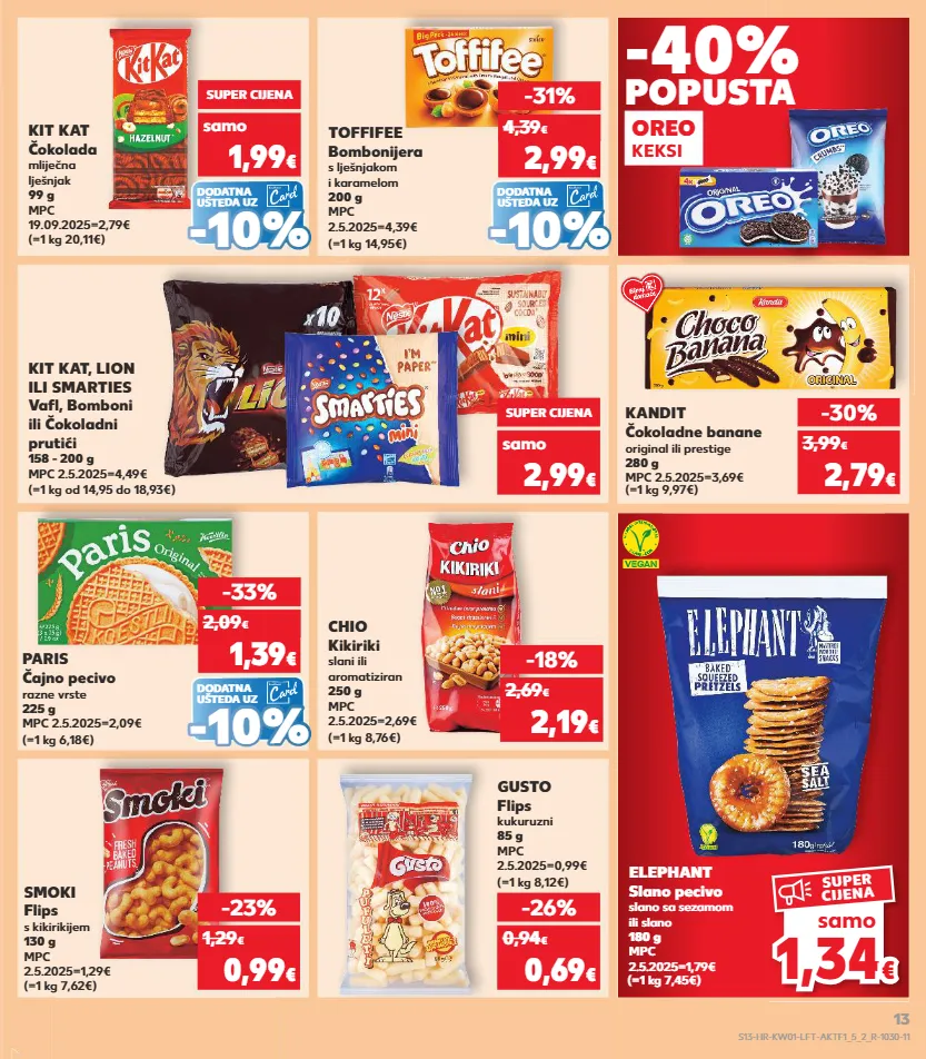 samo kratkotrajna ponuda kratkotrajna ponuda kratkotrajna ponuda kratkotrajna ponuda kratkotrajna ponuda kratkotrajna ponuda samo 2,09 € kratkotrajna ponuda kratkotrajna ponuda oreo keksi -40% popusta gusto flips kukuruzni 85 g mpc 2.5.2025=0,99€ (=1 kg 8,12€) -26% 0,69 € 0,94 € kit kat, lion ili smarties vafl, bomboni ili čokoladni prutići 158 - 200 g mpc 2.5.2025=4,49€ (=1 kg od 14,95 do 18,93€) samo super cijena 2,99 € chio kikiriki slani ili aromatiziran 250 g mpc 2.5.2025=2,69€ (=1 kg 8,76€) -18% 2,19 € 2,69 € (=1 kg 7,62€) smoki flips s kikirikijem 130 g mpc 2.5.2025=1,29€ -23% 0,99 € 1,29 € (=1 kg 9,97€) kandit čokoladne banane original ili prestige 280 g mpc 2.5.2025=3,69€ -30% 2,79 € 3,99 € (=1 kg 6,18€) paris čajno pecivo razne vrste 225 g mpc 2.5.2025=2,09€ (=1 kg 7,45€) elephant slano pecivo slano sa sezamom ili slano 180 g mpc 2.5.2025=1,79€ dodatna ušteda uz (=1 kg 14,95€) toffifee bombonijera s lješnjakom i karamelom 200 g mpc 2.5.2025=4,39€ -31% 2,99 € 4,39 € - - 10% 10% dodatna ušteda uz (=1 kg 20,11€) kit kat čokolada mliječna lješnjak 99 g mpc 19.09.2025=2,79€ super cijena samo 1,99 € - - 10% 10% 2,09 € dodatna ušteda uz -33% 1,39 € - - 10% 10% 1,34 1,34 € € samo super cijena s13-hr-kw01-lft-aktf1_5_2_r-1030-11 13