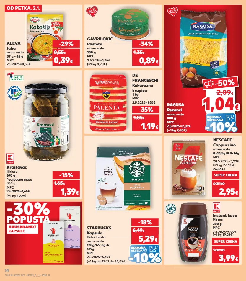 kratkotrajna ponuda kratkotrajna ponuda kratkotrajna ponuda kratkotrajna ponuda kratkotrajna ponuda samo kratkotrajna ponuda kratkotrajna ponuda od petka, 2.1. krastavac ii klasa 670 g *ocijeđena masa 330 g mpc 2.5.2025=1,65€ (=1 kg 4,22€) de franceschi kukuruzna krupica 1 kg mpc 2.5.2025=1,85€ -35% 1,19 € 1,85 € -15% 1,39 € 1,65 € -29% 0,39 € 0,55 € aleva juha razne vrste 37 g - 45 g mpc 2.5.2025=0,55€ -34% 0,89 € 1,35 € (=1 kg 8,90€) gavrilović pašteta razne vrste 100 g mpc 2.5.2025=1,35€ dodatna ušteda uz (=1 kg od 41,01 do 44,09€) starbucks kapsule dolce gusto razne vrste 120g,127,8g ili 129g mpc 2.5.2025=6,49€ (=1 kg 2,60€) ragusa rezanci razne vrste 400 g mpc 2.5.2025=2,09€ -18% 5,29 € 6,49 € - - 10% 10% nescafe cappuccino razne vrste 8x13,5g ili 8x14g mpc 20.5.2025=3,99€ (=1 kg 27,32 ili 26,34€) instant kava mocca 200 g mpc 2.5.2025=5,99€ (=1 kg 19,95€) samo super cijena 3,99 € samo super cijena 2,95 € 1,04 1,04 € € -50% 2,09 € dodatna ušteda uz - - 10% 10% hausbrandt kapsule -30% popusta s14-hr-kw01-lft-aktf1_6_1_l-1030-11 14