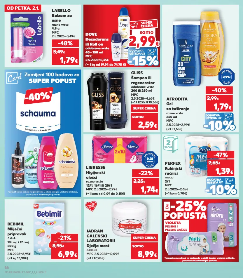 kratkotrajna ponuda kratkotrajna ponuda kratkotrajna ponuda kratkotrajna ponuda kratkotrajna ponuda kratkotrajna ponuda samo kratkotrajna ponuda samo violeta pelene i pelene gaćice -25% popusta zamijeni 100 bodova za super popust *popust se ne odnosi na proizvode u akciji, drugim vrstama sniženja, proizvode iz kratkotrajne ponude -40% * od petka, 2.1. do gliss šampon ili regenerator odabrane vrste 200 ili 250 ml mpc 2.5.2025=4,65€ (=1 l 12,95 ili 10,36€) libresse higijenski ulošci razne vrste 12/1, 16/1 ili 20/1 mpc 2.5.2025=2,99€ (=1 kom od 0,09 do 0,15€) bebimil mliječni pripravak 3 ili 4 10+mj. i 12+mj. 500 g mpc 2.5.2025=8,95€ (=1 kg 13,98€) jadran galenski laboratorij dječja mast 500 ml mpc 2.5.2025=12,09€ (=1 l 17,98€) super cijena samo 2,59 € -22% 1,74 € 2,25 € -21% 6,99 € 8,95 € samo super cijena 8,99 € -48% 1,79 € 3,49 € labello balzam za usne razne vrste 4,8 g mpc 2.5.2025=3,49€ dodatna ušteda uz dodatna ušteda uz dodatna ušteda uz (= 1 kg od 19,94 do 74,75 €) dove dezodorans ili roll on odabrane vrste 40 - 150 ml mpc 2.5.2025=5,35€ (=1 kom 0,70€) perfex kuhinjski ručnici mega 2/1 mpc 2.5.2025=2,65€ -47% 1,39 € 2,65 € (=1 l 7,16€) afrodita gel za tuširanje razne vrste 250 ml mpc 2.5.2025=2,99€ -40% 1,79 € 2,99 € - - 10% 10% - - 15% 15% - - 10% 10% 2,99 € 0,25 €/kom *popust se ne odnosi na proizvode u akciji, drugim vrstama sniženja, *popust se ne odnosi na proizvode u akciji, drugim vrstama sniženja, proizvode iz kratkotrajne ponude *popust se ne odnosi na proizvode u akciji, drugim vrstama sniženja, *popust se ne odnosi na proizvode u akciji, drugim vrstama sniženja, *popust se ne odnosi na proizvode u akciji, drugim vrstama sniženja, proizvode iz kratkotrajne ponude *popust se ne odnosi na proizvode u akciji, drugim vrstama sniženja, *popust se ne odnosi na proizvode u akciji, drugim vrstama sniženja, *popust se ne odnosi na proizvode u akciji, drugim vrstama sniženja, proizvode iz kratkotrajne ponude 2 sloja dodatna 2,99 2,99 € € samo super cijena s16-hr-kw01-lft-drp_1_1_l-1030-11 16