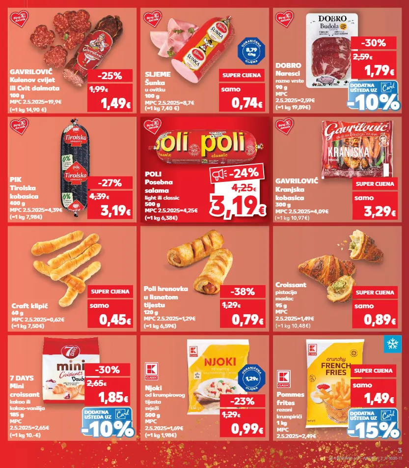 € kratkotrajna ponuda samo kratkotrajna ponuda samo kratkotrajna ponuda kratkotrajna ponuda kratkotrajna ponuda samo kratkotrajna ponuda samo kratkotrajna ponuda kratkotrajna ponuda kratkotrajna ponuda kratkotrajna ponuda kratkotrajna ponuda samo 2,25 -33% samo 1,29 € 8,79 €/kg gavrilović kulenov cvijet ili cvit dalmata 100 g mpc 2.5.2025=19,9€ (=1 kg 14,90 €) sljeme šunka u ovitku 100 g mpc 2.5.2025=8,7€ (=1 kg 7,40 €) -25% 1,49 € 1,99 € pik tirolska kobasica 400 g mpc 2.5.2025=4,39€ (=1 kg 7,98€) -27% 3,19 € 4,39 € samo super cijena 0,74 € poli posebna salama light ili classic 500 g mpc 2.5.2025=4,25€ (=1 kg 6,38€) gavrilović kranjska kobasica 300 g mpc 2.5.2025=4,09€ (=1 kg 10,97€) poli hrenovka u lisnatom tijestu 120 g mpc 2.5.2025=1,29€ (=1 kg 6,59€) samo super cijena 3,29 € -38% 0,79 € 1,29 € njoki od krumpirovog tijesta svježi 500 g mpc 2.5.2025=1,69€ (=1 kg 1,98€) -23% 0,99 € 1,29 € samo 2,65 € -30% dodatna ušteda uz (=1 kg 10.-€) 7 days mini croissant kakao ili kakao-vanilija 185 g mpc 2.5.2025=2,65€ 1,85 € - - 10% 10% (=1 kg 10,48€) (=1 kg 10,97€) 3,29 € (=1 kg 10,48€) croissant pistacija maslac 95 g mpc 2.5.2025=1,49€ samo super cijena 0,89 € 2,25 - 33% samo super cijena pommes frites rezani krumpirići 1 kg mpc 2.5.2025=2,49€ 1,49 € dodatna ušteda uz - - 15% 15% (=1 kg 7,50€) craft klipić 60 g mpc 2.5.2025=0,62€ samo super cijena 0,45 € dodatna ušteda uz (=1 kg 19,89€) dobro naresci razne vrste 90 g mpc 2.5.2025=2,59€ -30% 1,79 € 2,59 € - - 10% 10% 3,19 3,19 € € -24 % 4,25 € s3-hr-kw01-lft-aktf1_1_2_r-1030-11 3