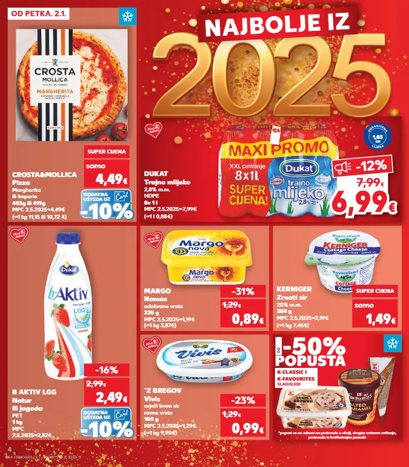 4,49 € kratkotrajna ponuda kratkotrajna ponuda samo ponuda super cijena kratkotrajna onuda kratkotrajna ponuda samo kratkotrajna ponuda kratkotrajna ponuda samo od petka. 2.1. najb olje iz 1,03 €/l margo namaz odabrane vrste 225 g mpc 2.5.2025=1,19€ (=1 kg 3,87€) kerniger zrnati sir 20% m.m. 200 g mpc 2.5.2025=2,19€ (=1 kg 7,45€) dukat trajno mlijeko 2,8% m.m. hdpe 8x 1 l mpc 2.5.2025=7,99€ (=1 l 0,88€) samo super cijena 1,49 € `z bregov vivis svježi krem sir razne vrste 100 g mpc 2.5.2025=1,29€ (=1 kg 9,90€) kratkotrajna kratkotrajna super cijena ponuda super cijena -23% 0,99 € 1,29 € -31% 0,89 € 1,29 € dodatna ušteda uz (=1 kg 11,15 ili 10,72 €) crosta&mollica pizza margherita ili imperia 403g ili 419g mpc 2.5.2025=4,49€ super cijena samo 4,49 € - - 10% 10% dodatna ušteda uz b aktiv lgg natur ili jagoda pet 1 kg mpc 2.5.2025=2,82€ -16% 2,49 € 2,99 € - - 10% 10% 6,99 6,99 € € -12% 7,99 € *popust se ne odnosi na proizvode u akciji, drugim vrstama sniženja, proizvode iz kratkotrajne ponude -50% popusta do k-classic i k-favourites sladoledi s4-hr-kw01-lft-aktf1_1_3_l-1030-11 4