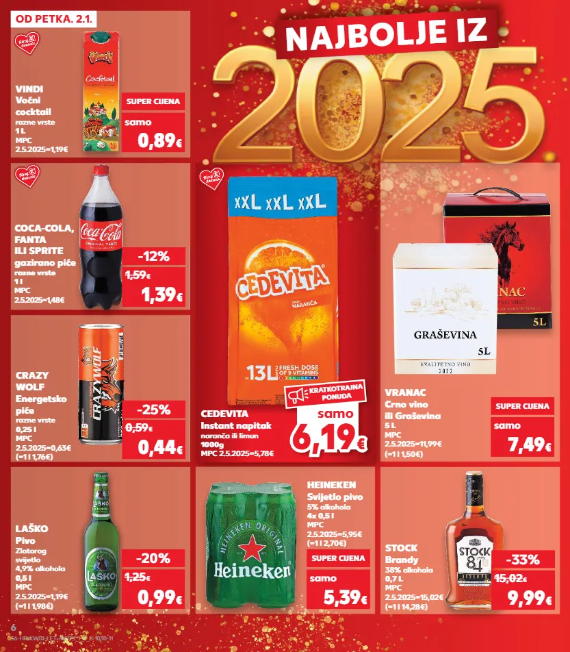 kratkotrajna ponuda kratkotrajna ponuda samo kratkotrajna ponuda samo kratkotrajna ponuda samo kratkotrajna ponuda super cijena kratkotrajna onuda kratkotrajna ponuda kratkotrajna ponuda kratkotrajna ponuda samo od petka. 2.1. najb olje iz vranac crno vino ili graševina 5 l mpc 2.5.2025=11,99€ (=1 l 1,50€) super cijena samo 7,49 € laško pivo zlatorog svijetlo 4,9% alkohola 0,5 l mpc 2.5.2025=1,19€ (=1 l 1,98€) -20% 0,99 € 1,25 € coca-cola, fanta ili sprite gazirano piće razne vrste 1 l mpc 2.5.2025=1,48€ -12% 1,39 € 1,59 € stock brandy 38% alkohola 0,7 l mpc 2.5.2025=15,02€ (=1 l 14,28€) kratkotrajna super cijena ponuda super cijena -33% 9,99 € 15,02 € heineken svijetlo pivo 5% alkohola 4x 0,5 l mpc 2.5.2025=5,95€ (=1 l 2,70€) samo super cijena 5,39 € samo super cijena 0,89 € vindi voćni cocktail razne vrste 1 l mpc 2.5.2025=1,19€ cedevita instant napitak naranča ili limun 1000g mpc 2.5.2025=5,78€ 6,19 6,19 € € samo kratkotrajna ponuda (=1 l 1,76€) crazy wolf energetsko piće razne vrste 0,25 l mpc 2.5.2025=0,63€ -25% 0,44 € 0,59 € s6-hr-kw01-lft-aktf1_1_5_l-1030-11 6