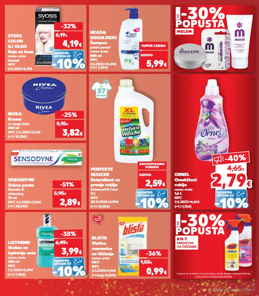 2,59 € kratkotrajna ponuda samo sa mo kratkotrajna ponuda kratkotrajna ponuda samo kratkotrajna ponuda kratkotrajna ponuda samo kratkotrajna ponuda samo 2,7 9 2,79 € € -40% 4,65 € -30% popusta do melem -30% popusta do kh-7 sredstva za čišćenje dodatna ušteda uz (=1 l 12,95€) perfekte wasche deterdžent za pranje rublja universal ili color 2 l mpc 28.11.2025=2,99€ (=1 l 1,75€) ornel omekšivač rublja razne vrste 1,6 l mpc 2.5.2025=4,65€ kratkotrajna ponuda samo 2,59 € - - 10% 10% dodatna ušteda uz - - 10% 10% dodatna ušteda uz syoss color ili oleo boje za kosu razne vrste komad mpc 2.5.2025=6,19€ -32% 4,19 € 6,19 € - - 10% 10% *popust se ne odnosi na proizvode u akciji, drugim vrstama sniženja, proizvode iz kratkotrajne ponude 6,49 € -38% sensodyne zubna pasta fluoride ili whitening 75 ml mpc 2.5.2025=3,95€ (=1 l 38,54€) -51% 2,89 € 5,95 € head& shoulders šampon protiv peruti razne vrste 800 ml mpc 2.5.2025=12,49€ (=1 l 7,49€) samo super cijena 5,99 € nivea krema za njegu kože 250 ml mpc 2.5.2025=5,15€ (=1 l 15,28€) -25% 3,82 € 5,15 € blista vlažne maramice za čišćenje razne vrste 50/1 mpc 2.5.2025=1,55€ (=1 kom 0,02€) -36% 0,99 € 1,55 € (=1 l 7,98€) listerine vodica za ispiranje usta razne vrste 500 ml mpc 2.5.2025=6,29€ 3,99 € dodatna ušteda uz - - 10% 10% -30% popusta -30% popusta *popust se ne odnosi na proizvode u akciji, drugim vrstama sniženja, proizvode iz kratkotrajne ponude *popust se ne odnosi na proizvode u akciji, drugim vrstama sniženja, za 57 pranja s7-hr-kw01-lft-aktf1_1_6_r-1030-11 7