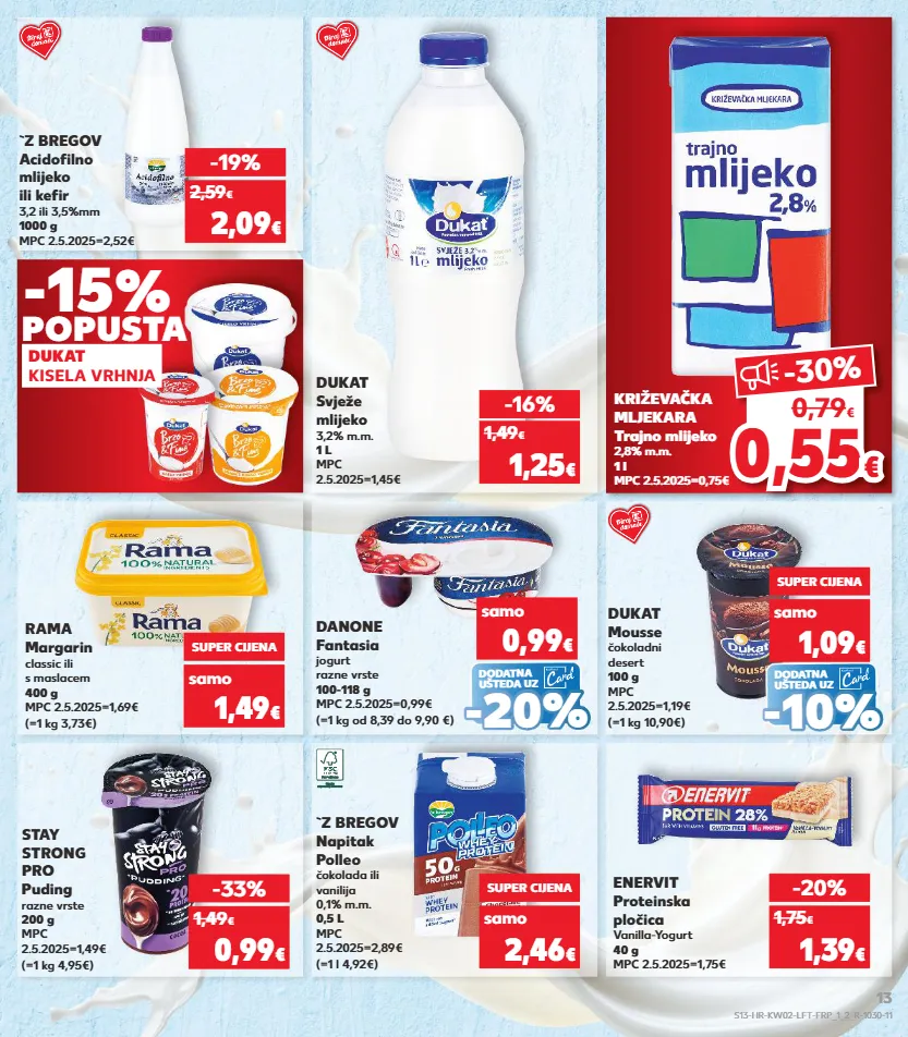 kratkotrajna ponuda kratkotrajna ponuda kratkotrajna ponuda kratkotrajna ponuda kratkotrajna ponuda kratkotrajna ponuda kratkotrajna ponuda 0,5 5 0,55 € € -30% 0,79 € rama margarin classic ili s maslacem 400 g mpc 2.5.2025=1,69€ (=1 kg 3,73€) super cijena 1,49 € dukat mousse čokoladni desert 100 g mpc 2.5.2025=1,19€ (=1 kg 10,90€) samo super cijena 1,09 € stay strong pro puding razne vrste 200 g mpc 2.5.2025=1,49€ (=1 kg 4,95€) `z bregov napitak polleo čokolada ili vanilija 0,1% m.m. 0,5 l mpc 2.5.2025=2,89€ (=1 l 4,92€) enervit proteinska pločica vanilla-yogurt 40 g mpc 2.5.2025=1,75€ -33% 0,99 € 1,49 € samo super cijena 2,46 € -20% 1,39 € 1,75 € dukat svježe mlijeko 3,2% m.m. 1 l mpc 2.5.2025=1,45€ -16% 1,25 € 1,49 € `z bregov acidofilno mlijeko ili kefir 3,2 ili 3,5%mm 1000 g mpc 2.5.2025=2,52€ -19% 2,09 € 2,59 € križevačka mljekara trajno mlijeko 2,8% m.m. 1 l mpc 2.5.2025=0,75€ (=1 kg od 8,39 do 9,90 €) danone fantasia jogurt razne vrste 100-118 g mpc 2.5.2025=0,99€ samo 0,99 € - - 20 % 20 % dodatna ušteda uz -15 % popusta dukat kisela vrhnja - - 10% 10% dodatna ušteda uz samo s13-hr-kw02-lft-frp_1_2_r-1030-11 13