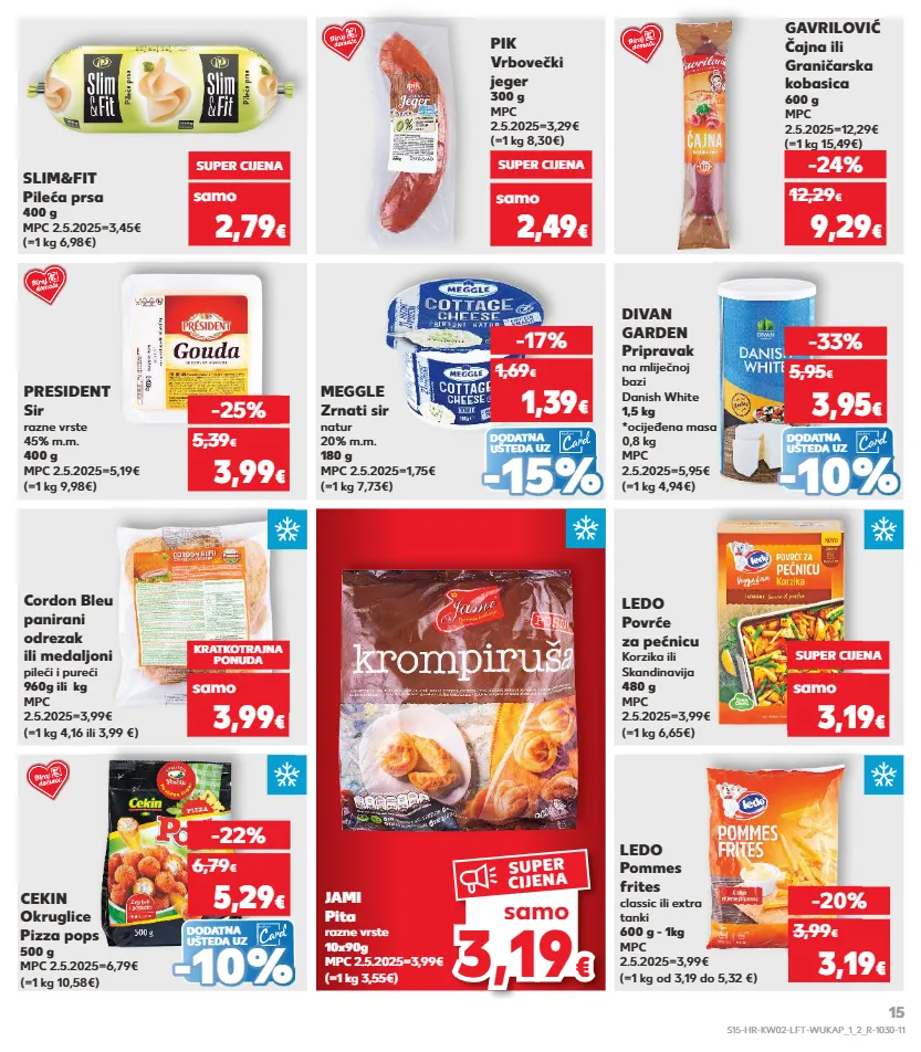 samo kratkotrajna ponuda kratkotrajna ponuda kratkotrajna ponuda kratkotrajna ponuda kratkotrajna ponuda kratkotrajna ponuda kratkotrajna ponuda kratkotrajna ponuda kratkotrajna ponuda samo 3,19 3,19 € € samo super cijena president sir razne vrste 45% m.m. 400 g mpc 2.5.2025=5,19€ (=1 kg 9,98€) divan garden pripravak na mliječnoj bazi danish white 1,5 kg *ocijeđena masa 0,8 kg mpc 2.5.2025=5,95€ (=1 kg 4,94€) -25% 3,99 € 5,39 € meggle zrnati sir natur 20% m.m. 180 g mpc 2.5.2025=1,75€ (=1 kg 7,73€) -17% 1,39 € 1,69 € -33% 3,95 € 5,95 € cordon bleu panirani odrezak ili medaljoni pileći i pureći 960g ili kg mpc 2.5.2025=3,99€ (=1 kg 4,16 ili 3,99 €) ledo povrće za pećnicu korzika ili skandinavija 480 g mpc 2.5.2025=3,99€ (=1 kg 6,65€) kratkotrajna ponuda 3,99 € super cijena 3,19 € ledo pommes frites classic ili extra tanki 600 g - 1kg mpc 2.5.2025=3,99€ (=1 kg od 3,19 do 5,32 €) -20% 3,19 € 3,99 € (=1 kg 6,98€) slim&fit pileća prsa 400 g mpc 2.5.2025=3,45€ samo super cijena 2,79 € (=1 kg 8,30€) pik vrbovečki jeger 300 g mpc 2.5.2025=3,29€ super cijena 2,49 € (=1 kg 15,49€) gavrilović čajna ili graničarska kobasica 600 g mpc 2.5.2025=12,29€ -24% 9,29 € 12,29 € dodatna ušteda uz (=1 kg 10,58€) cekin okruglice pizza pops 500 g mpc 2.5.2025=6,79€ -22% 5,29 € 6,79 € - - 10% 10% jami pita razne vrste 10x90g mpc 2.5.2025=3,99€ (=1 kg 3,55€) dodatna ušteda uz - - 15% 15% dodatna ušteda uz - - 10% 10% samo samo samo s15-hr-kw02-lft-wukap_1_2_r-1030-11 15