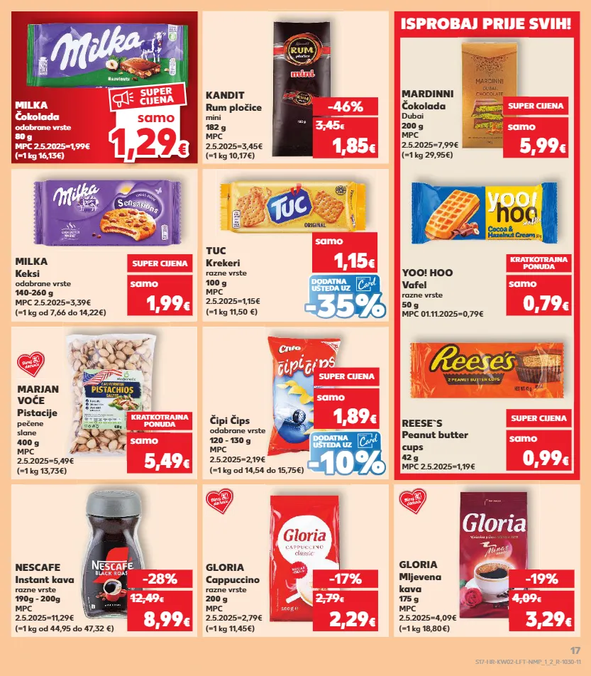 kratkotrajna ponuda kratkotrajna ponuda kratkotrajna ponuda kratkotrajna ponuda kratkotrajna ponuda kratkotrajna ponuda kratkotrajna ponuda kratkotrajna ponuda isprobaj prije svih! 1,89 € milka keksi odabrane vrste 140-260 g mpc 2.5.2025=3,39€ (=1 kg od 7,66 do 14,22€) yoo! hoo vafel razne vrste 50 g mpc 01.11.2025=0,79€ super cijena 1,99 € kratkotrajna ponuda 0,79 € reese`s peanut butter cups 42 g mpc 2.5.2025=1,19€ mardinni čokolada dubai 200 g mpc 2.5.2025=7,99€ (=1 kg 29,95€) super cijena 5,99 € samo super cijena 0,99 € nescafe instant kava razne vrste 190g - 200g mpc 2.5.2025=11,29€ (=1 kg od 44,95 do 47,32 €) gloria cappuccino razne vrste 200 g mpc 2.5.2025=2,79€ (=1 kg 11,45€) gloria mljevena kava 175 g mpc 2.5.2025=4,09€ (=1 kg 18,80€) -28% 8,99 € 12,49 € -17% 2,29 € 2,79 € -19% 3,29 € 4,09 € (=1 kg 10,17€) kandit rum pločice mini 182 g mpc 2.5.2025=3,45€ -46% 1,85 € 3,45 € (=1 kg 16,13€) milka čokolada odabrane vrste 80 g mpc 2.5.2025=1,99€ (=1 kg 13,73€) marjan voće pistacije pečene slane 400 g mpc 2.5.2025=5,49€ kratkotrajna ponuda 5,49 € 1,89 € dodatna ušteda uz (=1 kg od 14,54 do 15,75€) čipi čips odabrane vrste 120 - 130 g mpc 2.5.2025=2,19€ super cijena samo 1,89 € - - 10% 10% (=1 kg 11,50 €) tuc krekeri razne vrste 100 g mpc 2.5.2025=1,15€ samo 1,15 € - - 35 % 35 % dodatna ušteda uz samo samo samo samo 1,29 1,29 € € samo super cijena s17-hr-kw02-lft-nmp_1_2_r-1030-11 17