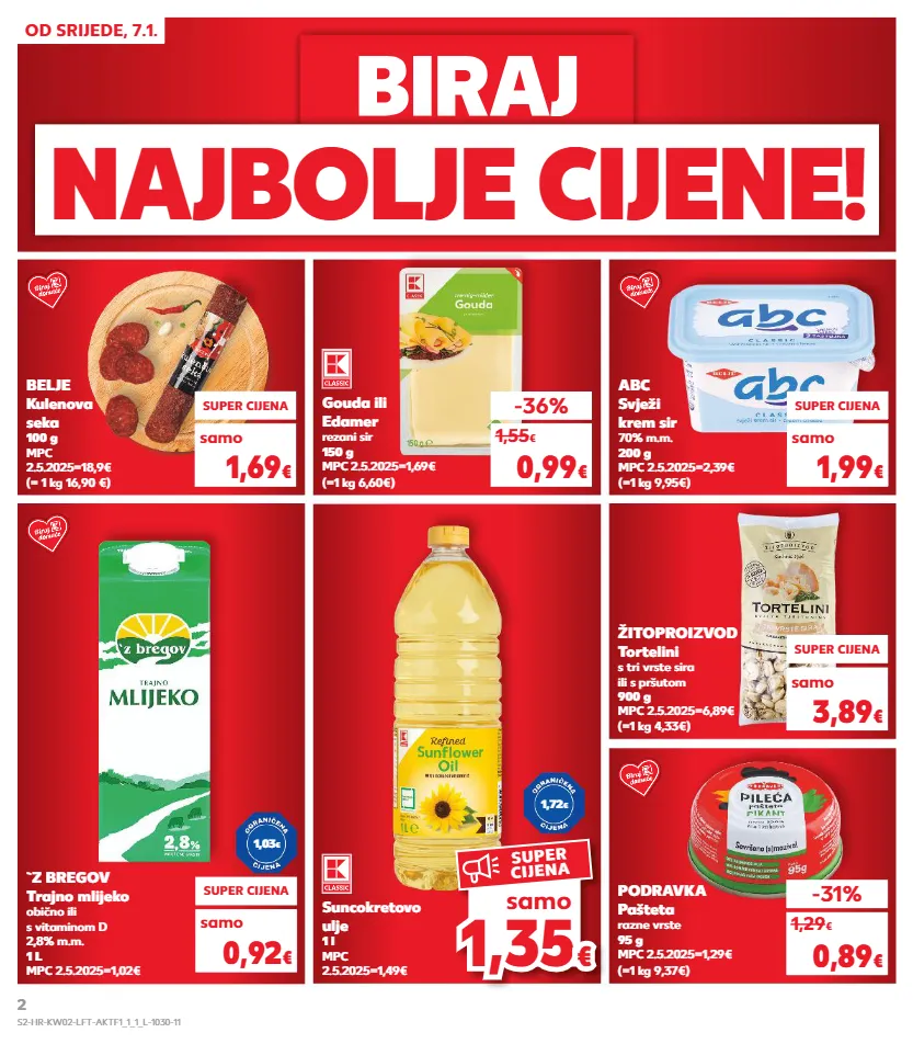 kratkotrajna ponuda samo kratkotrajna ponuda samo kratkotrajna ponuda samo kratkotrajna ponuda samo kratkotrajna ponuda samo kratkotrajna ponuda samo od srijede, 7.1. biraj biraj najbolje cijene! 1,3 5 1,35 € € samo super cijena `z bregov trajno mlijeko obično ili s vitaminom d 2,8% m.m. 1 l mpc 2.5.2025=1,02€ suncokretovo ulje 1 l mpc 2.5.2025=1,49€ gouda ili edamer rezani sir 150 g mpc 2.5.2025=1,69€ (=1 kg 6,60€) super cijena 0,92 € samo podravka pašteta razne vrste 95 g mpc 2.5.2025=1,29€ (=1 kg 9,37€) -31% 0,89 € 1,29 € -36% 0,99 € 1,55 € super cijena 3,89 € samo (=1 kg 4,33€) žitoproizvod tortelini s tri vrste sira ili s pršutom 900 g mpc 2.5.2025=6,89€ super cijena 1,69 € samo (= 1 kg 16,90 €) belje kulenova seka 100 g mpc 2.5.2025=18,9€ super cijena 1,99 € samo (=1 kg 9,95€) abc svježi krem sir 70% m.m. 200 g mpc 2.5.2025=2,39€ 1,72 € 1,03 € s2-hr-kw02-lft-aktf1_1_1_l-1030-11 2
