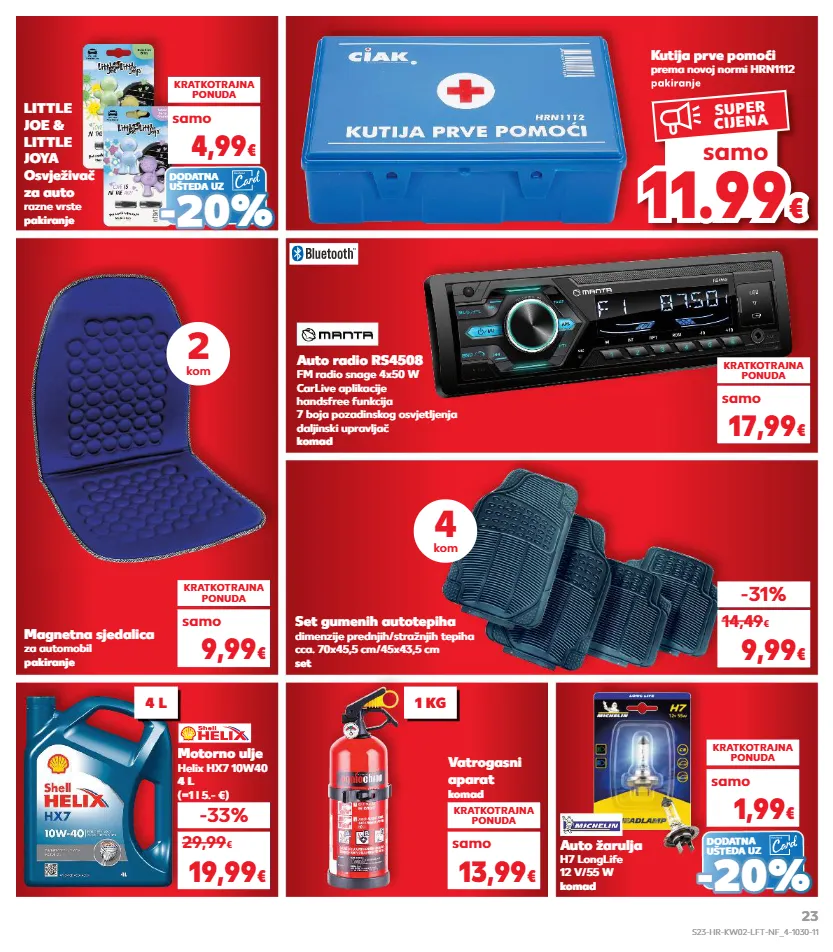 kratkotrajna ponuda kratkotrajna ponuda auto žarulja h7 longlife 12 v/55 w komad kratkotrajna ponuda 1,99 € samo kutija prve pomoći prema novoj normi hrn1112 pakiranje pakiranje 11.99 € samo super cijena little joe & little joya osvježivač za auto razne vrste pakiranje kratkotrajna ponuda samo 4,99 € set gumenih autotepiha dimenzije prednjih/stražnjih tepiha cca. 70x45,5 cm/45x43,5 cm set -31% 9,99 € auto radio rs4508 fm radio snage 4x50 w carlive aplikacije handsfree funkcija 7 boja pozadinskog osvjetljenja daljinski upravljač komad kratkotrajna ponuda 17,99 € samo 14,49 € motorno ulje helix hx7 10w40 4 l (=1 l 5.- €) vatrogasni aparat komad kratkotrajna ponuda -33% 19,99 € 13,99 € 29,99 € samo magnetna sjedalica za automobil pakiranje kratkotrajna ponuda 9,99 € samo 2 kom 4 kom 4 l 1 kg dodatna ušteda uz - - 20 % 20 % dodatna ušteda uz - - 20 % 20 % s23-hr-kw02-lft-nf_4-1030-11 23