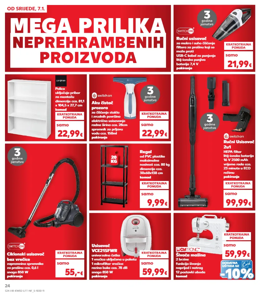 kg 1 5 7 mega prilika neprehr ambenih pr oiz v od a od srijede, 7.1. ručni usisavač 2u1 hepa filter litij-ionska baterija 16 v 2500 mah vrijeme rada cca. 23 minute u eco režimu pakiranje kratkotrajna ponuda samo kratkotrajna ponuda super cijena kratkotrajna super cijena kratkotrajna ponuda super cijena onuda 99,99 € polica uključuje pribor za montažu dimenzije cca. 81,1 x 104,5 x 27,7 cm komad kratkotrajna ponuda 22,99 € samo ručni usisavač za mokro i suho čišćenje filtera za prašinu koji se može prati usb-c kabel za punjenje litij-ionska punjiva baterija 7,4 v pakiranje 3 3 kratkotrajna ponuda samo kratkotrajna ponuda super cijena kratkotrajna super cijena kratkotrajna ponuda super cijena onuda 21,99 € usisavač vce21sfwr univerzalna četka 1 vrećica uključena u paketu 1 mikrofilter vrećica razina buke cca. 78 db snaga 850 w pakiranje kratkotrajna ponuda samo kratkotrajna ponuda super cijena kratkotrajna super cijena kratkotrajna ponuda super cijena onuda 59,99 € šivaća mašina 2 brzine funkcija šivanja naprijed i natrag 12 postavki uboda komad 3 ciklonski usisavač bez vrećice zapremnina spremnika za prašinu cca. 0,6 l snaga 850 w pakiranje kratkotrajna ponuda samo kratkotrajna ponuda super cijena kratkotrajna super cijena kratkotrajna ponuda super cijena onuda 55,- € kratkotrajna ponuda 59,99 € samo regal od pvc plastike maksimalna nosivost cca. 80 kg dimenzije cca. 30x60x138 cm komad kratkotrajna ponuda 9,99 € samo aku čistač prozora za čišćenje stakla i zrcalnih površina električno usisavanje radna širina cca. 28cm spremnik za prljavu vodu cca. 150ml pakiranje 3 kratkotrajna ponuda 22,99 € samo 20 kg dodatna ušteda uz - - 10% 10% s24-hr-kw02-lft-nf_5-1030-11 24