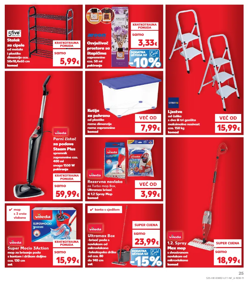 kratkotrajna ponuda kratkotrajna ponuda već od već od 7,99 € 3,99 € već od 15,99 € ✓ kanta s cjedilom već od već od parni čistač za podove steam plus spremnik zapremnine cca. 400 ml snaga 1550 w pakiranje parni čistač parni čistač kratkotrajna ponuda 59,99 € samo rezervna navlaka za turbo mop box, ultramax brisač ili 1.2 spray mop komad ljestve od čelika s dva ili tri gazišta maksimalna nosivost cca. 150 kg komad stalak za cipele od metala i plastike dimenzije cca. 50x18,4x65 cm komad kratkotrajna ponuda 5,99 € samo kutija za pohranu od plastike razne dimenzije razne zapremnine komad osvježivač prostora sa štapićima zapremnine cca. 50 ml pakiranje super mocio 3action mop za brisanje poda s kantom i drškom duljine cca. 130 cm set kratkotrajna ponuda 15,99 € samo super cijena 23,99 € samo rezervna navlaka za turbo mop box, rezervna navlaka za turbo mop box, ultramax box -brisač poda s navlakom od mikrovlakana -teleskopska drška od cca. 80 do 140 cm set ultramax box rezervna navlaka 1.2. spray max mop s dvostranom navlakom od mikrovlakana komad super cijena 18,99 € samo 1.2. spray super mocio 3action dodatna ušteda uz - - 15% 15% kratkotrajna ponuda 3,33 € samo dodatna ušteda uz - - 10% 10% ✓ mop s 3 vrste vlakana s25-hr-kw02-lft-nf_6-1030-11 25