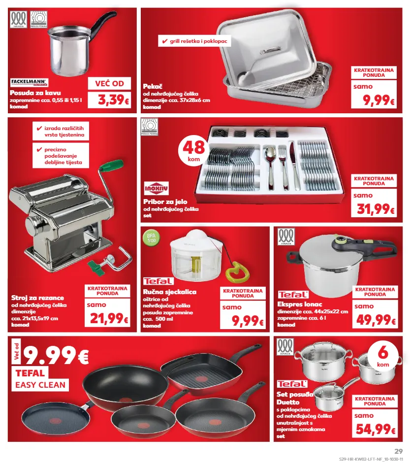 već od 3,39 € već od posuda za kavu zapremnine cca. 0,55 ili 1,15 l komad pribor za jelo od nehrđajućeg čelika set kratkotrajna ponuda 31,99 € samo stroj za rezance od nehrđajućeg čelika dimenzije cca. 21x13,5x19 cm komad ručna sjeckalica oštrice od nehrđajućeg čelika posuda zapremnine cca. 500 ml komad kratkotrajna ponuda 9,99 € samo kratkotrajna ponuda 21,99 € samo pekač od nehrđajućeg čelika dimenzije cca. 37x28x6 cm komad kratkotrajna ponuda 9,99 € samo ✓ grill rešetka i poklopac ✓ izrada različitih vrsta tjestenina ✓ precizno podešavanje debljine tijesta 48 kom set posuđa duetto s poklopcima od nehrđajućeg čelika unutrašnjost s mjernim oznakama set ekspres lonac dimenzije cca. 44x25x22 cm zapremnine cca. 6 l komad kratkotrajna ponuda kratkotrajna ponuda 54,99 € 49,99 € samo samo 6 kom 9.99 € easy clean tefal već od s29-hr-kw02-lft-nf_10-1030-11 29