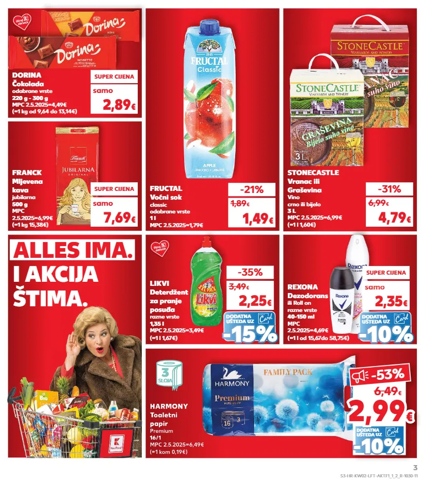 kratkotrajna ponuda kratkotrajna ponuda samo kratkotrajna ponuda samo kratkotrajna ponuda samo kratkotrajna ponuda samo kratkotrajna ponuda samo dodatna ušteda uz (=1 kom 0,19€) harmony toaletni papir premium 16/1 mpc 2.5.2025=6,49€ (=1 l od 15,67do 58,75€) rexona dezodorans ili roll on razne vrste 40-150 ml mpc 2.5.2025=4,69€ super cijena samo 2,35 € o 2,34 samo 2,34 samo 2,34 samo 2,34 samo samo € o € o - - 10% 10% fructal voćni sok classic odabrane vrste 1 l mpc 2.5.2025=1,79€ -21% 1,49 € 1,89 € (=1 kg od 9,64 do 13,14€) dorina čokolada odabrane vrste 220 g - 300 g mpc 2.5.2025=4,49€ super cijena 2,89 € samo (=1 kg 15,38€) franck mljevena kava jubilarna 500 g mpc 2.5.2025=6,99€ super cijena 7,69 € samo (=1 l 1,60€) stonecastle vranac ili graševina vino crno ili bijelo 3 l mpc 2.5.2025=6,99€ -31% 4,79 € 6,99 € dodatna ušteda uz (=1 l 1,67€) likvi deterdžent za pranje posuđa razne vrste 1,35 l mpc 2.5.2025=3,49€ -35% 2,25 € 3,49 € - - 15% 15% 3 sloja dodatna ušteda uz - - 10% 10% 2,99 2,99 € € -53 % 6,49 € (=1 kom 0,19€) harmony toaletni papir premium 16/1 mpc 2.5.2025=6,49€ alles ima. i akcija štima. s3-hr-kw02-lft-aktf1_1_2_r-1030-11 3
