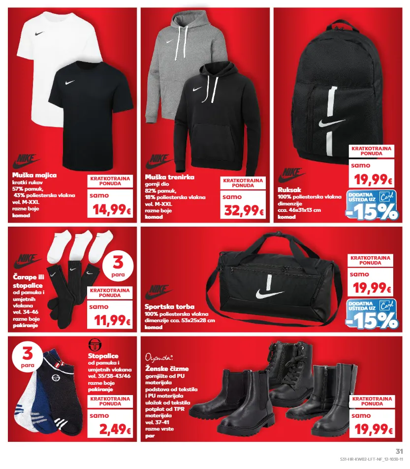 čarape ili stopalice od pamuka i umjetnih vlakana vel. 34-46 razne boje pakiranje sportska torba 100% poliesterska vlakna dimenzije cca. 53x25x28 cm komad kratkotrajna ponuda 19,99 € kratkotrajna ponuda 11,99 € samo samo ženske čizme gornjište od pu materijala podstava od tekstila i pu materijala uložak od tekstila potplat od tpr materijala vel. 37-41 razne vrste par kratkotrajna ponuda kratkotrajna ponuda 19,99 € 2,49 € samo samo stopalice od pamuka i umjetnih vlakana vel. 35/38-43/46 razne boje pakiranje 3 para 3 para dodatna ušteda uz - - 15% 15% muška trenirka gornji dio 82% pamuk, 18% poliesterska vlakna vel. m-xxl razne boje komad muška majica kratki rukav 57% pamuk, 43% poliesterska vlakna vel. m-xxl razne boje komad kratkotrajna ponuda 14,99 € samo kratkotrajna ponuda 32,99 € samo ruksak 100% poliesterska vlakna dimenzije cca. 46x31x13 cm komad kratkotrajna ponuda 19,99 € samo dodatna ušteda uz - - 15% 15% s31-hr-kw02-lft-nf_12-1030-11 31