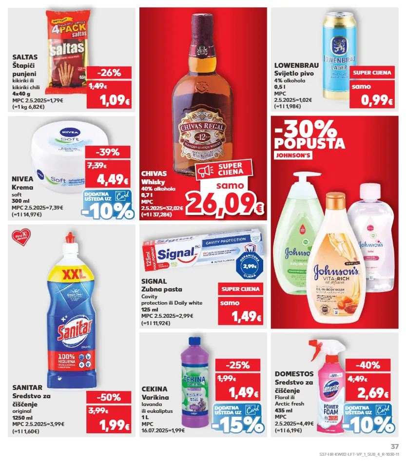 kratkotrajna ponuda kratkotrajna ponuda kratkotrajna ponuda kratkotrajna ponuda kratkotrajna ponuda samo kratkotrajna ponuda samo kratkotrajna ponuda samo 2 6,09 26,09 € € samo super cijena signal zubna pasta cavity protection ili daily white 125 ml mpc 2.5.2025=2,99€ (=1 l 11,92€) samo super cijena 1,49 € sanitar sredstvo za čišćenje original 1250 ml mpc 2.5.2025=3,99€ (=1 l 1,60€) -50% 1,99 € 3,99 € (=1 l 37,28€) chivas whisky 40% alkohola 0,7 l mpc 2.5.2025=32,02€ (=1 kg 6,82€) saltas štapići punjeni kikiriki ili kikiriki chili 4x40 g mpc 2.5.2025=1,79€ -26% 1,09 € 1,49 € (=1 l 1,98€) lowenbrau svijetlo pivo 4% alkohola 0,5 l mpc 2.5.2025=1,02€ samo super cijena 0,99 € dodatna ušteda uz dodatna ušteda uz cekina varikina lavanda ili eukaliptus 1 l mpc 16.07.2025=1,99€ (=1 l 6,19€) domestos sredstvo za čišćenje floral ili arctic fresh 435 ml mpc 2.5.2025=4,49€ -25% 1,49 € 1,99 € -40% 2,69 € 4,49 € - - 15% 15% - - 10% 10% johnson‘s -30% popusta 2,99 € dodatna ušteda uz (=1 l 14,97€) nivea krema soft 300 ml mpc 2.5.2025=7,39€ -39% 4,49 € 7,39 € - - 10% 10% s37-hr-kw02-lft-vp_1_sub_4_r-1030-11 37