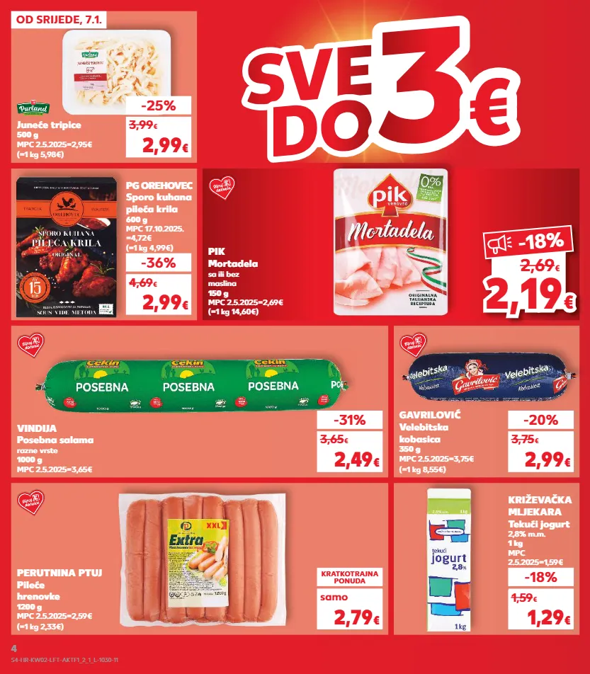 kratkotrajna ponuda samo kratkotrajna ponuda samo samo kratkotrajna ponuda samo kratkotrajna ponuda samo kratkotrajna ponuda samo 2,19 2,19 € € -18% 2,69 € od srijede, 7.1. sv e sv e do do 3 3 € € gavrilović velebitska kobasica 350 g mpc 2.5.2025=3,75€ (=1 kg 8,55€) vindija posebna salama razne vrste 1000 g mpc 2.5.2025=3,65€ perutnina ptuj pileće hrenovke 1200 g mpc 2.5.2025=2,59€ (=1 kg 2,33€) juneće tripice 500 g mpc 2.5.2025=2,95€ (=1 kg 5,98€) č i s t a k v a l i t e t a -31% 2,49 € 3,65 € -20% 2,99 € 3,75 € kratkotrajna ponuda 2,79 € samo -25% 2,99 € 3,99 € (=1 kg 14,60€) pik mortadela sa ili bez maslina 150 g mpc 2.5.2025=2,69€ -18% 1,29 € 1,59 € križevačka mljekara tekući jogurt 2,8% m.m. 1 kg mpc 2.5.2025=1,59€ -36% 2,99 € 4,69 € (=1 kg 4,99€) pg orehovec sporo kuhana pileća krila 600 g mpc 17.10.2025. =4,72€ s4-hr-kw02-lft-aktf1_2_1_l-1030-11 4