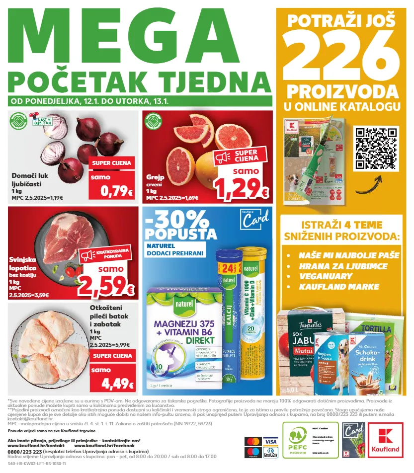 -38% 1,29 € kratkotrajna ponuda kratkotrajna ponuda samo pefc/23-31-86 pefc certified this product is from sustainably managed forests www.pefc.co.uk 226 u online katalogu potraži još proizvoda istraži 4 teme sniženih proizvoda: od ponedjeljka, 12.1. do utorka, 13.1. početak tjedna mega *sve navedene cijene izražene su u eurima s pdv-om. ne odgovaramo za tiskarske pogreške. fotografije proizvoda ne moraju 100% odgovarati dotičnim proizvodima. proizvode iz aktualne ponude možete kupiti samo u količinama predviđenim za kućanstvo. **pojedini proizvodi označeni kao kratkotrajna ponuda dostupni su količinski i vremenski strogo ograničeno, te je za istima u pravilu potražnja povećana. stoga upućujemo naše cijenjene kupce da je sve detalje oko istih moguće dobiti na našem info-pultu izravno, ili pak unaprijed putem upravljanja odnosa s kupcima, na broj 0800/223 223 ili putem e.maila kontakt@kaufland.hr mpc=maloprodajna cijena u smislu čl. 4. st. 1. t. 11. zakona o zaštiti potrošača (nn 19/22, 59/23) 0800 / 223 223 (besplatni telefon upravljanja odnosa s kupcima) radno vrijeme upravljanja odnosa s kupcima: pon - pet, od 8:00 do 20:00 / sub od 8:00 do 17:00 ako imate pitanja, prijedloge ili primjedbe – kontaktirajte nas! www.kaufland.hr/kontakt www.kaufland.hr/facebook ponuda vrijedi samo za sve kaufl and trgovine. od ponedjeljka, 12.1. do utorka, 13.1. početak tjedna početak tjedna 2,5 9 2,59 € € samo kratkotrajna ponuda • naše mi najbolje paše • kaufland marke • veganuary • hrana za ljubimce grejp crveni 1 kg mpc 2.5.2025=1,69€ domaći luk ljubičasti 1 kg mpc 2.5.2025=1,19€ svinjska lopatica bez kostiju 1 kg mpc 2.5.2025=3,59€ otkošteni pileći batak i zabatak 1 kg mpc 2.5.2025=5,99€ k a u f l a n d k v a l i t e t a o b e ć a n j e s v j e ž i n e k a u f l a n d k v a l i t e t a o b e ć a n j e s v j e ž i n e samo 0,79 € super cijena 4,49 € naturel dodaci prehrani -30% popusta samo super cijena 1,29 1,29 € € samo super cijena s40-hr-kw02-lft-rs-1030-11