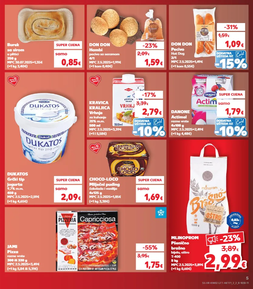 kratkotrajna ponuda samo kratkotrajna ponuda samo kratkotrajna ponuda samo kratkotrajna ponuda samo kratkotrajna ponuda samo kratkotrajna ponuda kratkotrajna ponuda kratkotrajna ponuda samo samo 1,5 2,99 2,99 € € -23 % 3,89 € 0,83 € /1kg dukatos grčki tip jogurta 9,7% m.m. 450 g mpc 2.5.2025=2,59€ (=1 kg 4,65€) jami pizza razne vrste 300 ili 330 g mpc 2.5.2025=3,49€ (=1 kg 5,84 ili 5,31€) super cijena 2,09 € samo -55% 1,75 € 3,95 € choco-loco mliječni puding čokolada i vanilija 4x125 g mpc 2.5.2025=1,85€ (=1 kg 3,38€) super cijena 1,69 € samo (=1 kom 0,40€) don don hambi pecivo sa sezamom 4/1 mpc 2.5.2025=1,99€ -23% 1,59 € 2,09 € (=1 kg 3,40€) burek sa sirom u plitici 250 g mpc 30.07.2025=1,35€ super cijena 0,85 € samo (=1 kg 0,60€) mlinoprom pšenično brašno bijelo, oštro t-400 5 kg mpc 2.5.2025=3,89€ dodatna ušteda uz dodatna ušteda uz dodatna ušteda uz (=1 l 5,58€) kravica kraljica vrhnje za kuhanje 20% m.m. 500 ml mpc 2.5.2025=3,39€ (=1 kom 0,55€) don don pecivo hot dog 2/1 mpc 2.5.2025=1,49€ (=1 kg 4,48€) danone actimel razne vrste 4x100 g mpc 2.5.2025=2,49€ -31% -17% super cijena 1,09 € 1,59 € 2,79 € 3,39 € samo 1,79 € sa o 1,59 sam 1,59 sam sam 1,59 sam sam o € o - - 15% 15% - - 10% 10% - - 10% 10% s5-hr-kw02-lft-aktf1_2_2_r-1030-11 5