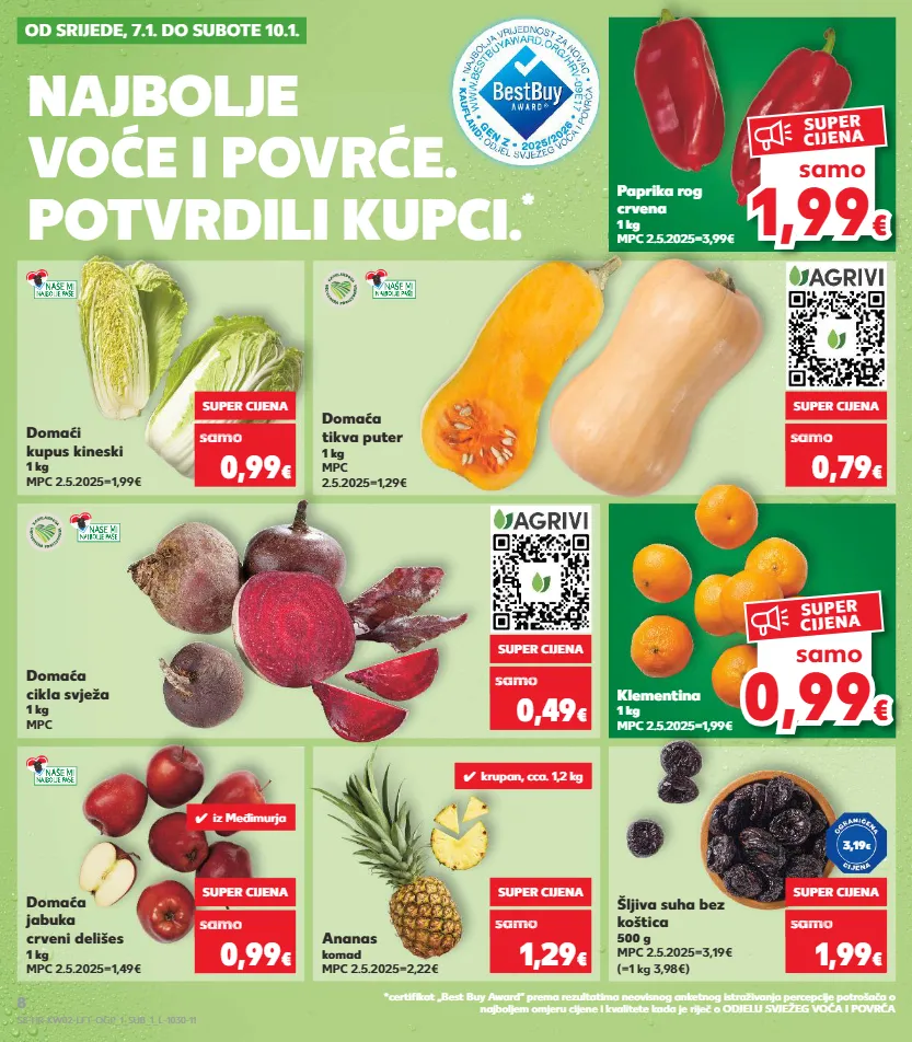 od srijede, 7.1. do subote 10.1. 0,99 0,99 € € samo super cijena 1,99 € € samo super cijena 1,99 1,99 1,99 domaća tikva puter 1 kg mpc 2.5.2025=1,29€ domaći kupus kineski 1 kg mpc 2.5.2025=1,99€ domaća cikla svježa 1 kg mpc klementina 1 kg mpc 2.5.2025=1,99€ ananas komad mpc 2.5.2025=2,22€ šljiva suha bez koštica 500 g mpc 2.5.2025=3,19€ (=1 kg 3,98€) super cijena samo 0,99 € sa o 1,49 sam 1,49 sam 1,4 sam 1,49 sam samo o € o super cijena samo 0,79 € samo 1,19 sam 1,19 sam 1,19 sam 1,19 sam sam o € o super cijena samo 0,49 € sa o 0,79 samo 0,79 samo 0,7 samo 0,79 samo samo € o € o super cijena samo 1,29 € o 2,22 samo 2,22 samo 2,2 samo 2,22 samo samo € o € o super cijena samo 1,99 € o 3,19 sam 3,19 sam 3,19 sam 3,19 sam samo o € o paprika rog crvena 1 kg mpc 2.5.2025=3,99€ 3,19 € najbolje voće i povrće. potvrdili kupci. * *certifikat „best buy award“ prema rezultatima neovisnog anketnog istraživanja percepcije potrošača o najboljem omjeru cijene i kvalitete kada je riječ o odjelu svježeg voća i povrća voće i povrće. ✓ krupan, cca. 1,2 kg domaća jabuka crveni delišes 1 kg mpc 2.5.2025=1,49€ super cijena samo 0,99 € sa o 1,69 sam 1,69 sam 1,6 sam 1,69 sam sam o € o ✓ iz međimurja s8-hr-kw02-lft-ogp_1_sub_1_l-1030-11 8